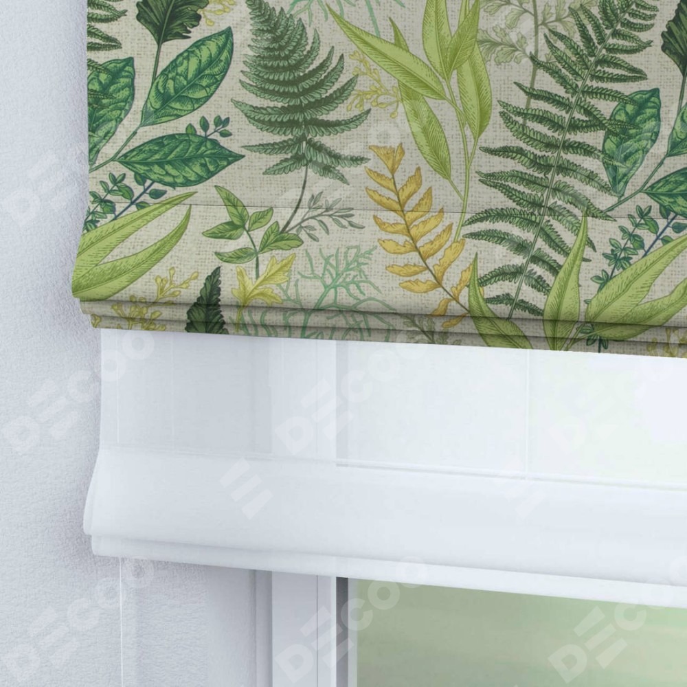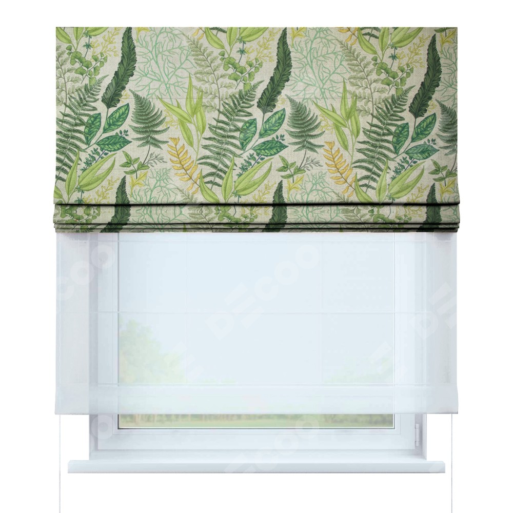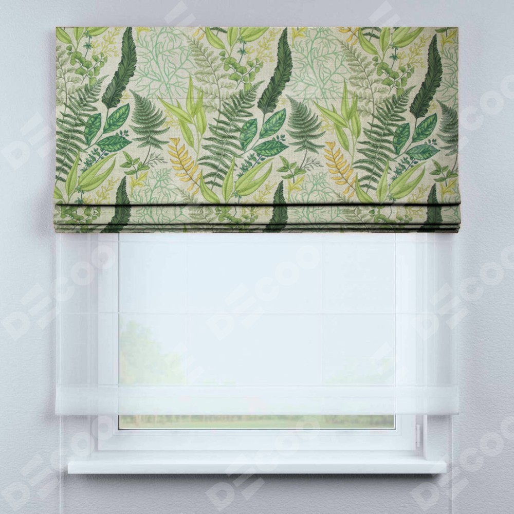 Римская штора день-ночь производителя «Cortin», используется для проёма, пошита из двух полотен, с лицевой стороны «Весна», вторая ткань тюль (по стандарту комплектуется тюль белого цвета артикул V-01). Имеет универсальный механизм и подходит для монтажа: на потолок, на стену и в нишу.
