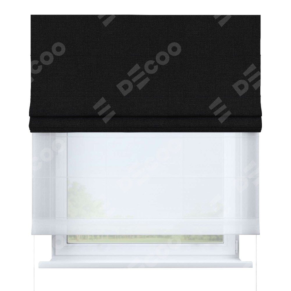 Римская штора день-ночь производителя «Cortin», используется для проёма, пошита из двух полотен, с лицевой стороны лён чёрный артикул 85927, вторая ткань тюль (по стандарту комплектуется тюль белого цвета артикул V-01). Имеет универсальный механизм и подходит для монтажа: на потолок, на стену и в нишу.