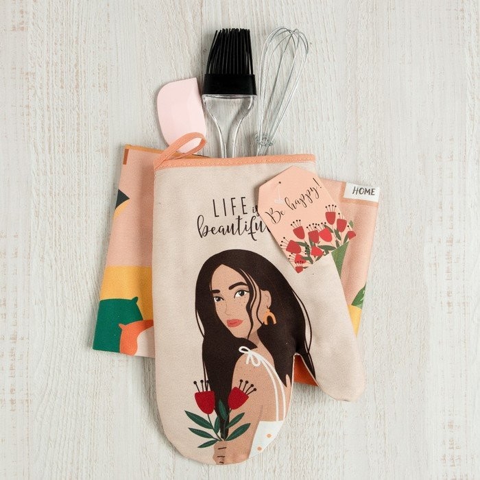 Набор подарочный Life is beautiful: полотенце, варежка-прихватка, кисть, лопатка, венчик