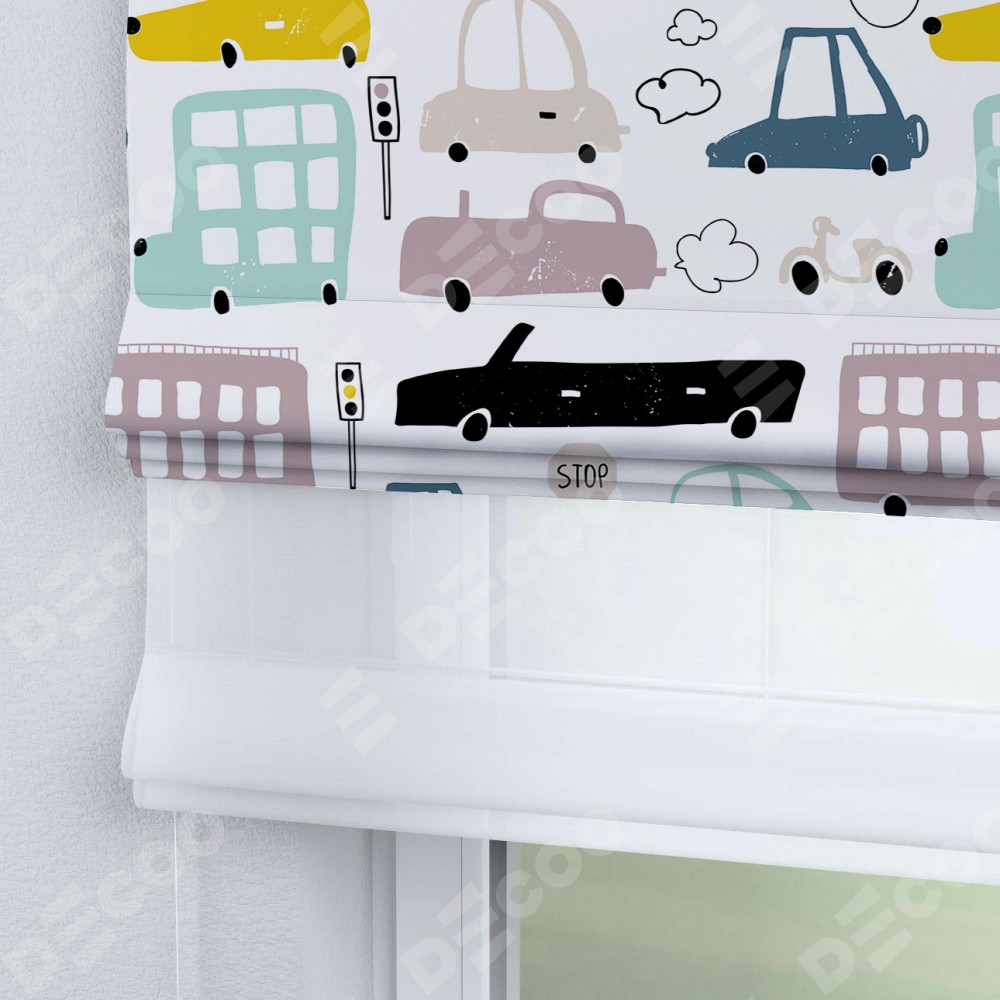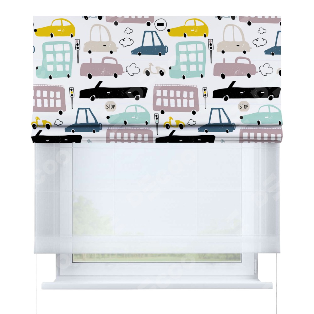 Римская штора день-ночь производителя «Cortin», используется для проёма, пошита из двух полотен, с лицевой блэкаут с нанесением сублимационной печати «Красочный трафик», вторая ткань тюль (по стандарту комплектуется тюль белого цвета артикул V-01). Имеет универсальный механизм и подходит для монтажа: на потолок, на стену и в нишу.