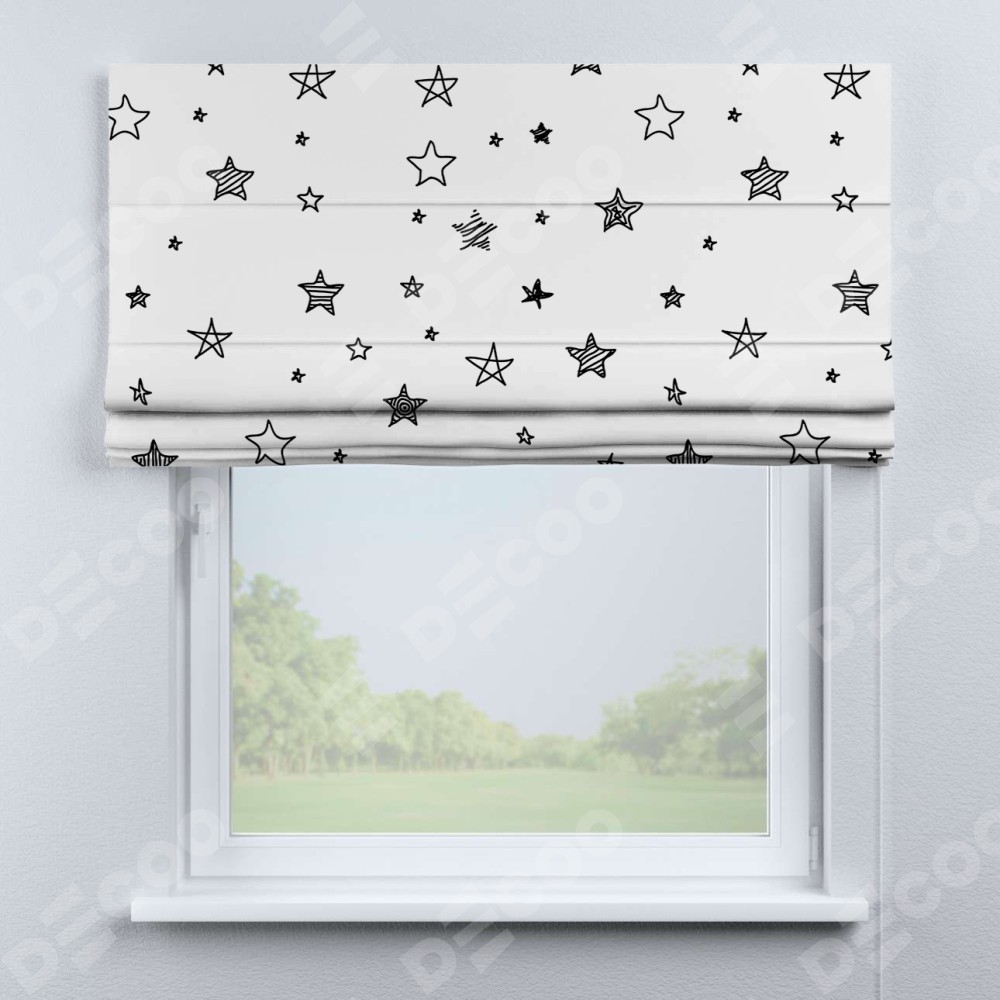 Римская штора производителя «Cortin», используется для проёма, пошита из ткани блэкаут с нанесением сублимационной печати «Звёзды». Имеет универсальный механизм и подходит для монтажа: на потолок, на стену и в нишу.