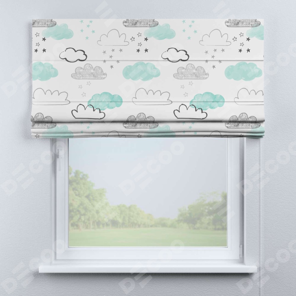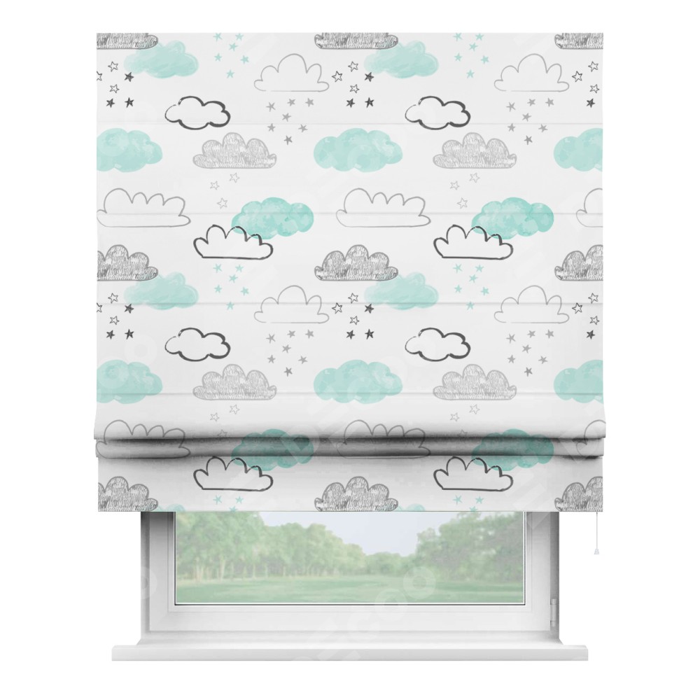 Римская штора производителя «Cortin», используется для проёма, пошита из ткани блэкаут с нанесением сублимационной печати «Облака и звёзды». Имеет универсальный механизм и подходит для монтажа: на потолок, на стену и в нишу.