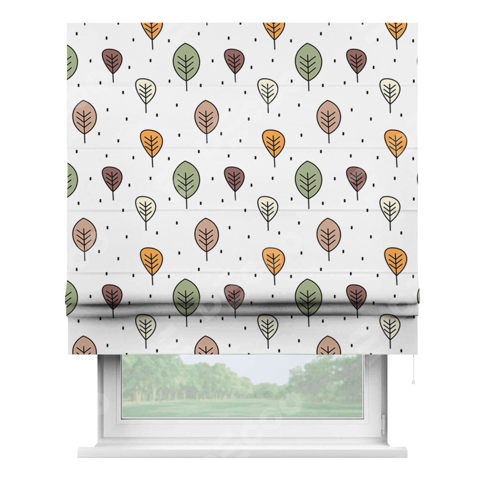 Римская штора производителя «Cortin», используется для проёма, пошита из ткани блэкаут с нанесением сублимационной печати «Простые деревья». Имеет универсальный механизм и подходит для монтажа: на потолок, на стену и в нишу.