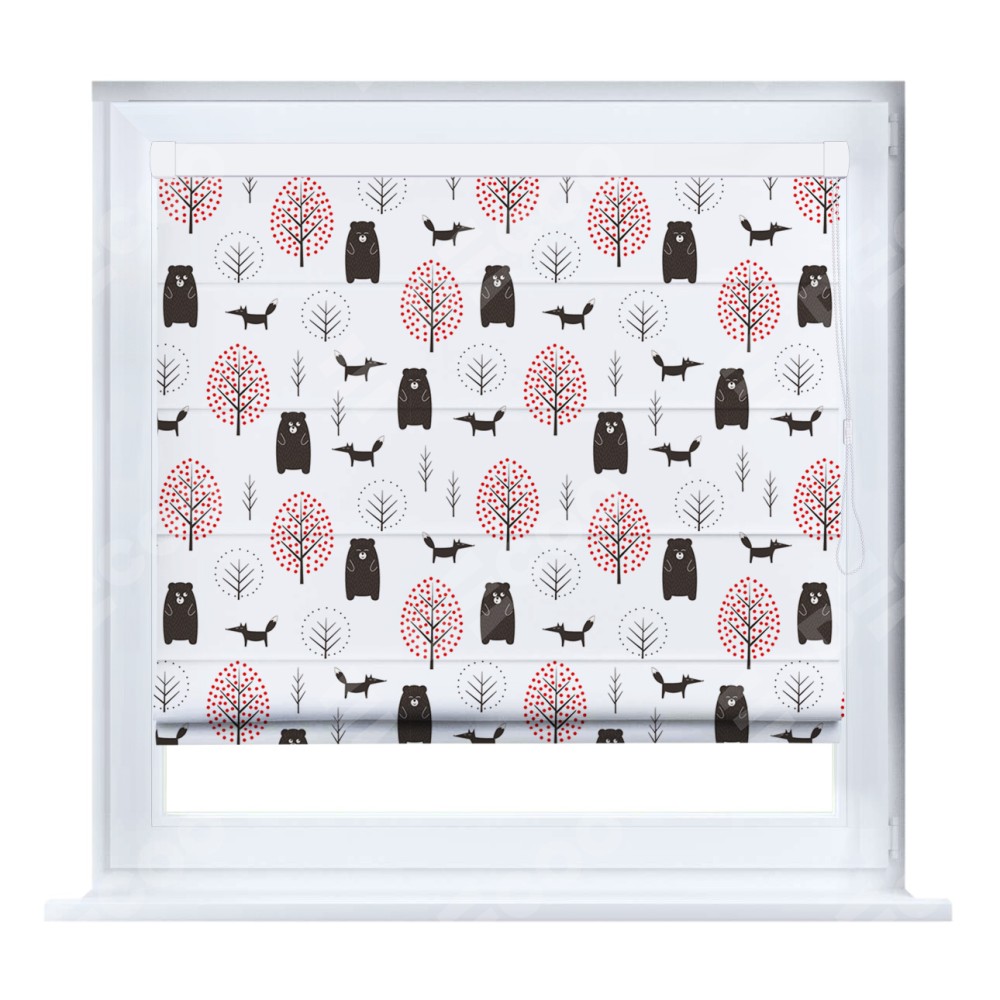 Римская штора кассетного типа, производителя «Cortin», устанавливается только на пластиковые окна и прилегает к стеклопакету, пошита из ткани блэкаут с нанесением сублимационной печати «Сканди лес».