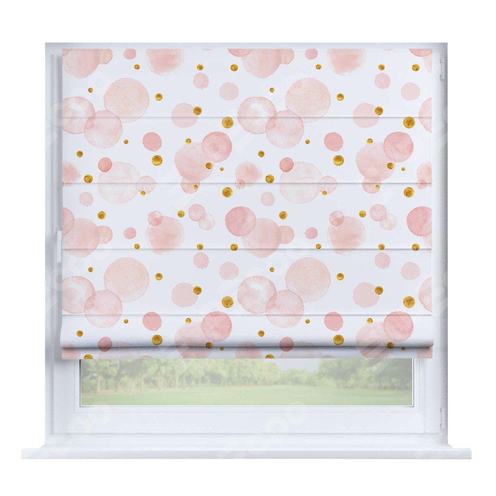 Римская штора производителя «Cortin», устанавливается на створку окна, пошита из ткани блэкаут с нанесением сублимационной печати «Круги и точки». Штора шьётся по индивидуальным размерам, для данного типа римской шторы возможная ширина от 35 до 150 см., высота до 250 см.