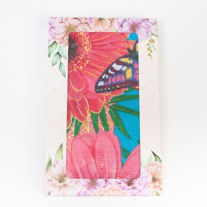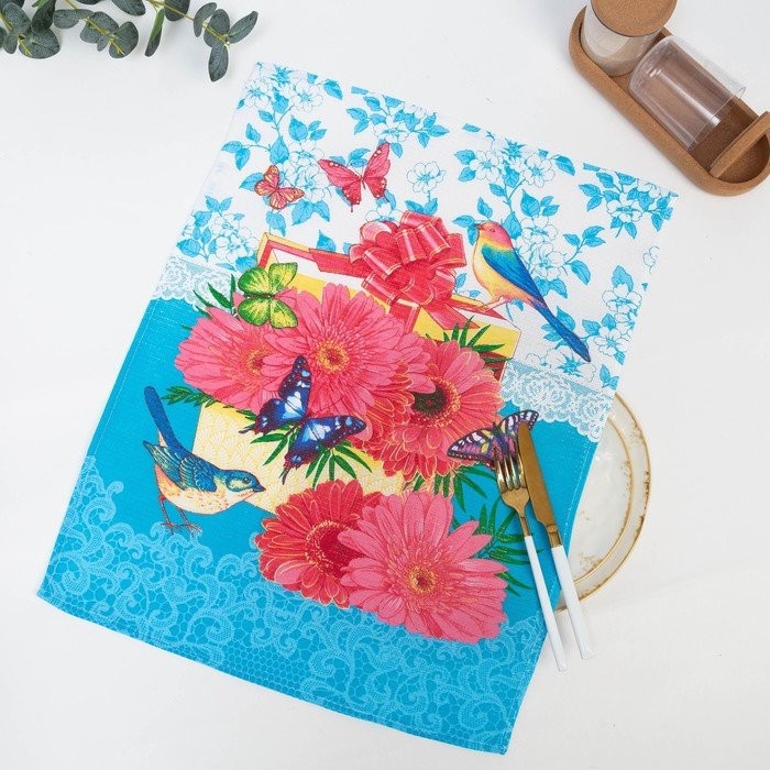 Полотенце в коробке 45×60 см, Герберы, бирюза, вафля, 160 гр/м2, хлопок 100%