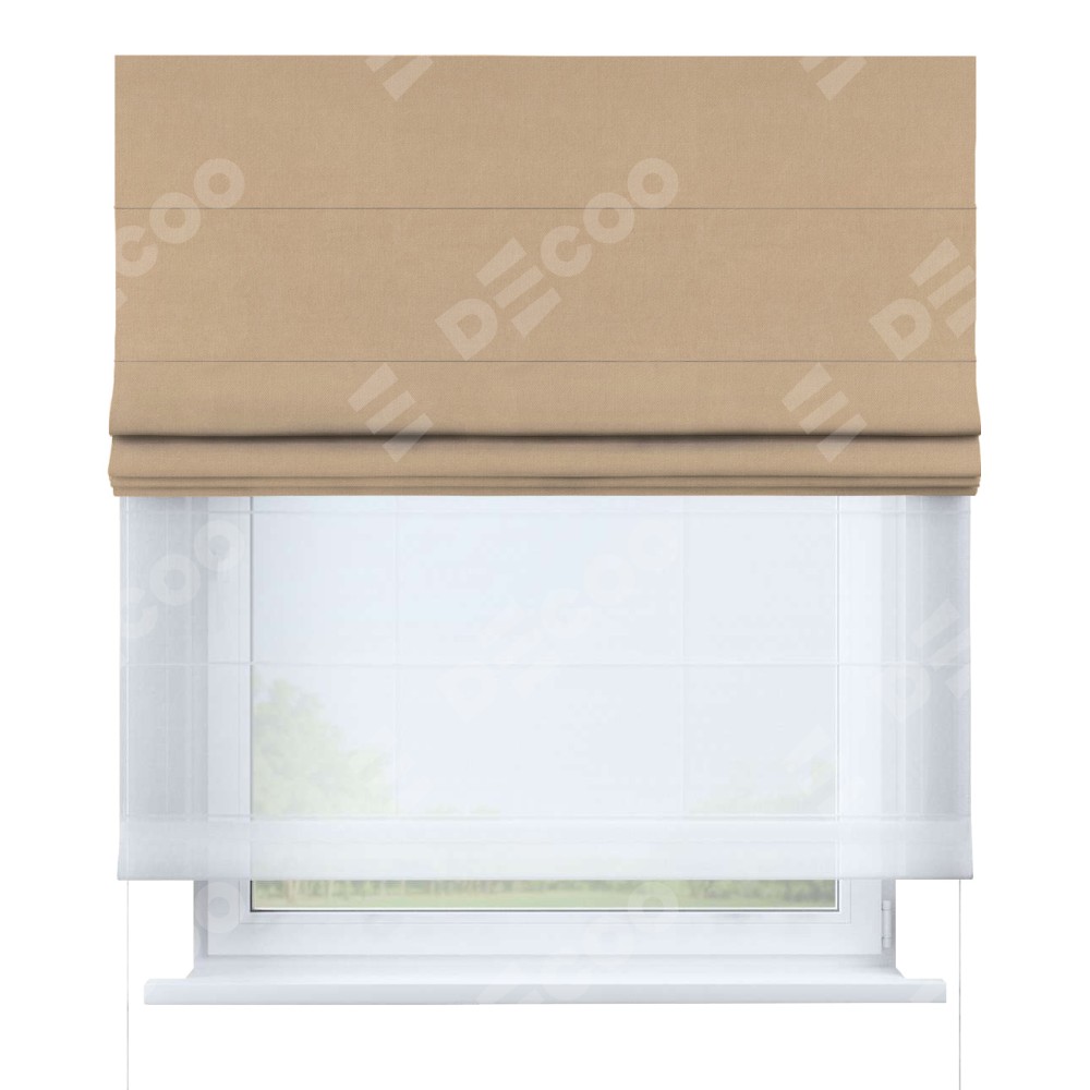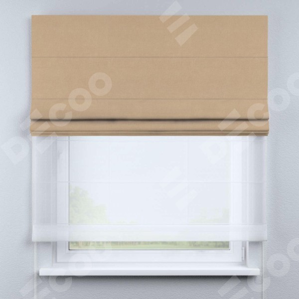 Римская штора день-ночь производителя «Cortin», используется для проёма, пошита из двух полотен, с лицевой стороны вельвет песочный артикул 17740, вторая ткань тюль (по стандарту комплектуется тюль белого цвета артикул V-01). Имеет универсальный механизм и подходит для монтажа: на потолок, на стену и в нишу.