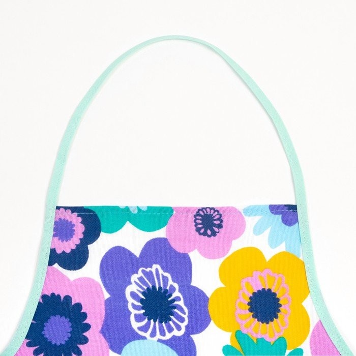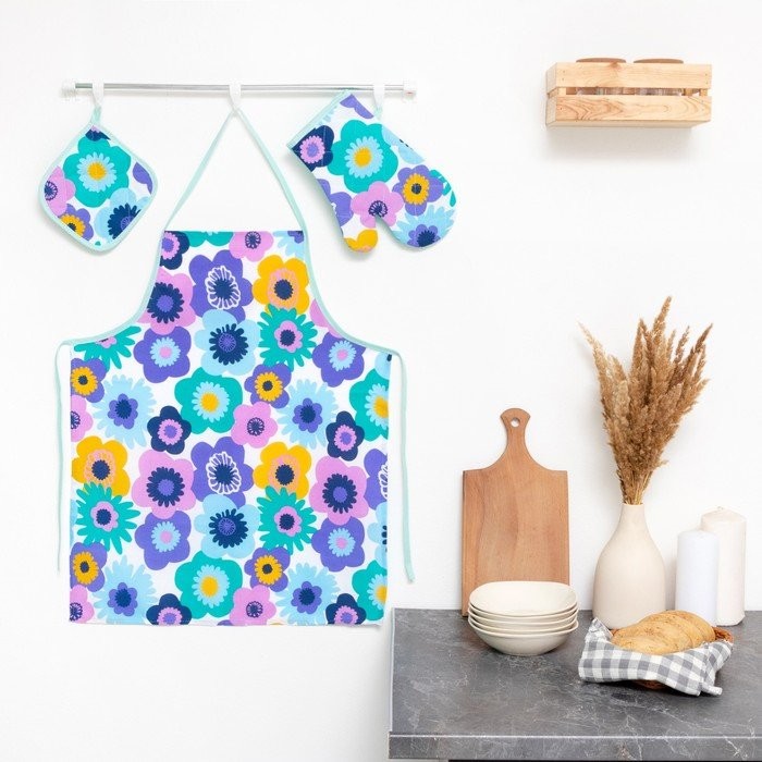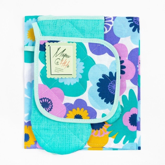 Кухонный набор Мари Санна Цветы+бирюза (прихватка+рукавица+фартук), рогожка