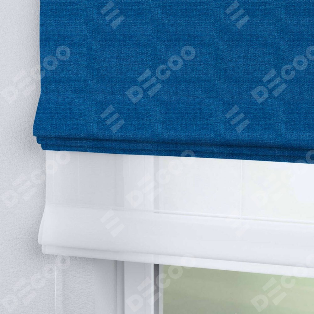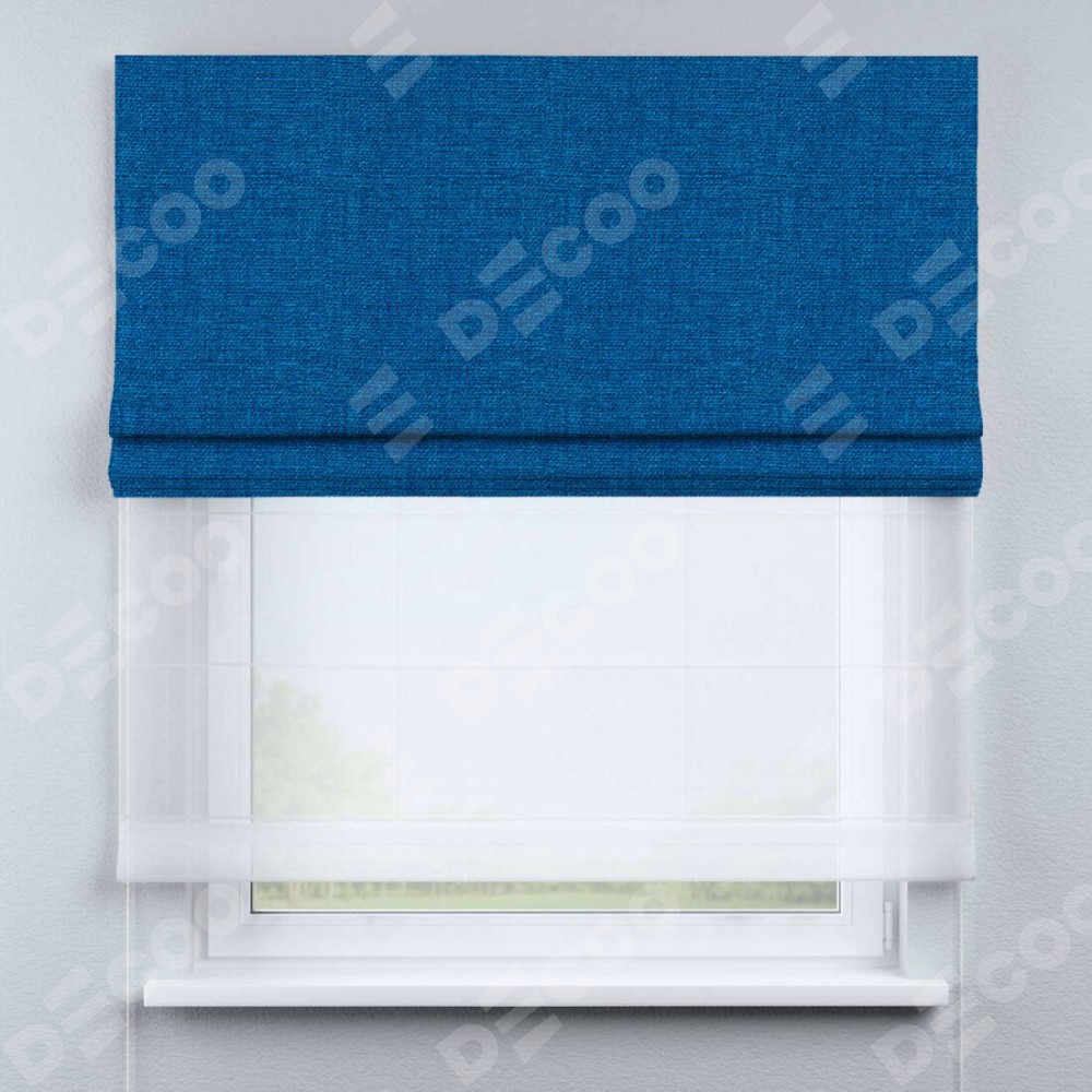 Римская штора день-ночь производителя «Cortin», используется для проёма, пошита из двух полотен, с лицевой стороны лён синий артикул 63742, вторая ткань тюль (по стандарту комплектуется тюль белого цвета артикул V-01). Имеет универсальный механизм и подходит для монтажа: на потолок, на стену и в нишу.