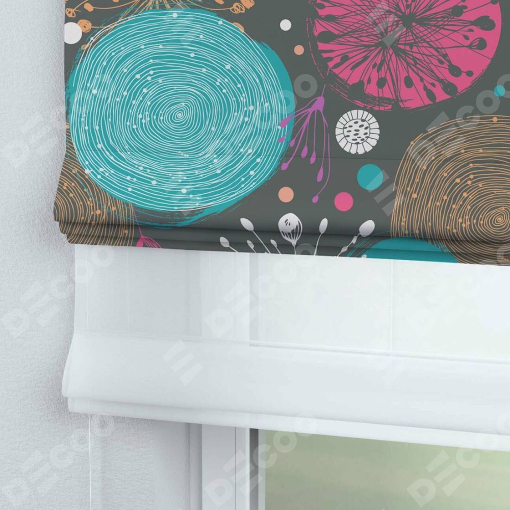 Есть модель римских штор в которой первый слой из плотной ткани, защищающий от яркого солнечного света, а втрой слой из тюля. Тюль в такой модели штор дает легкость и прозрачность помещению. А также защищает от посторонних взглядов и рассеивает не яркий свет.