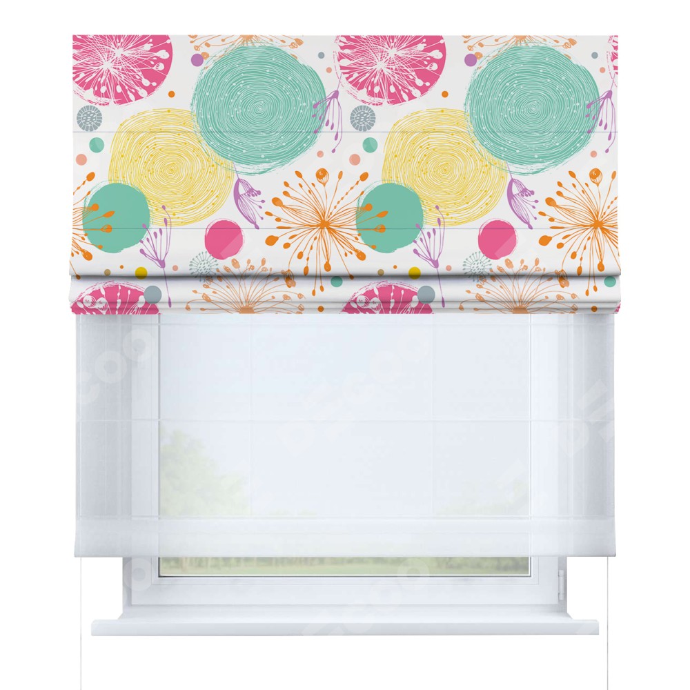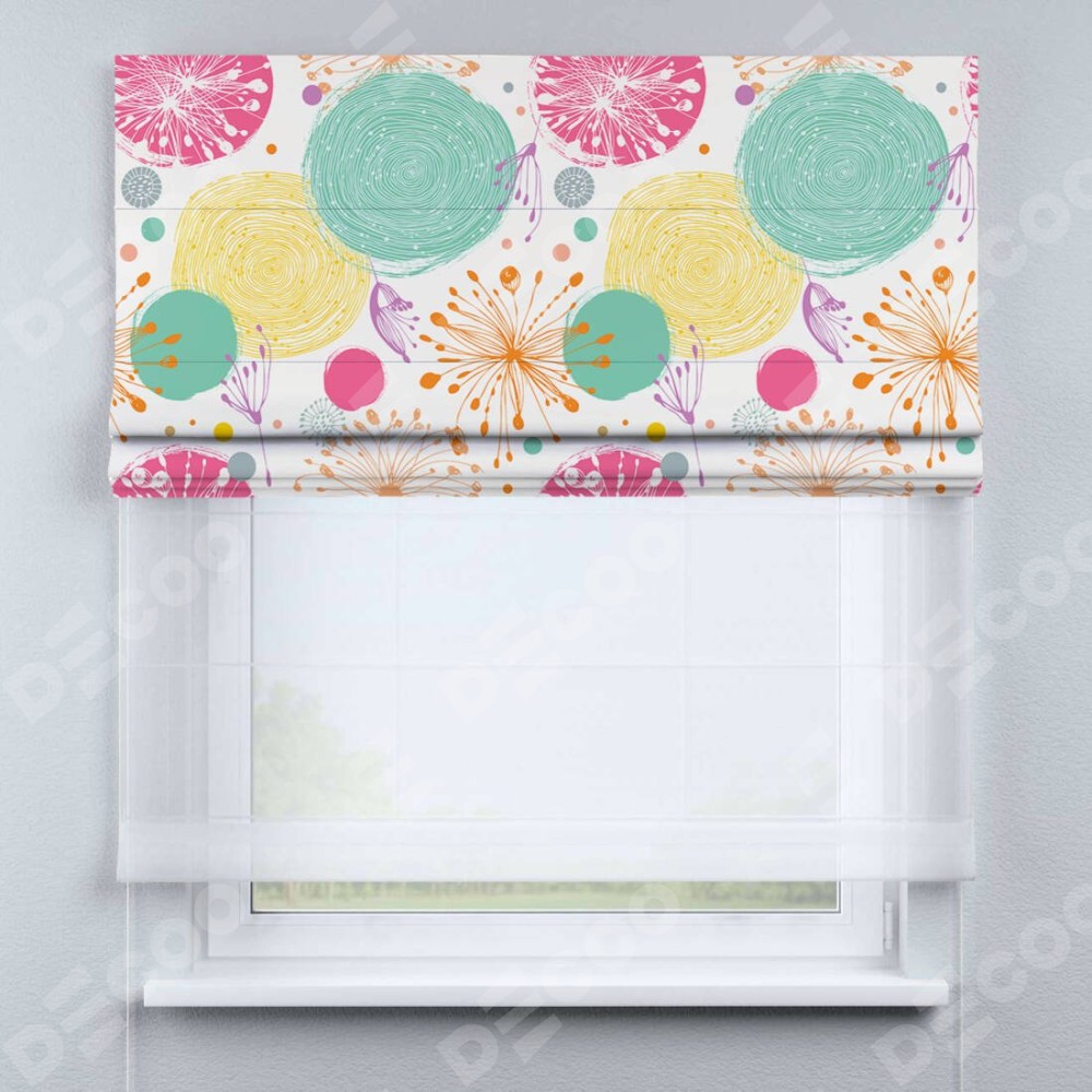Римская штора день-ночь производителя «Cortin», используется для проёма, пошита из двух полотен, с лицевой блэкаут с нанесением сублимационной печати «Забавные детали», вторая ткань тюль (по стандарту комплектуется тюль белого цвета артикул V-01). Имеет универсальный механизм и подходит для монтажа: на потолок, на стену и в нишу.