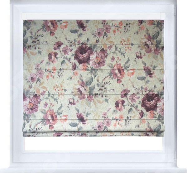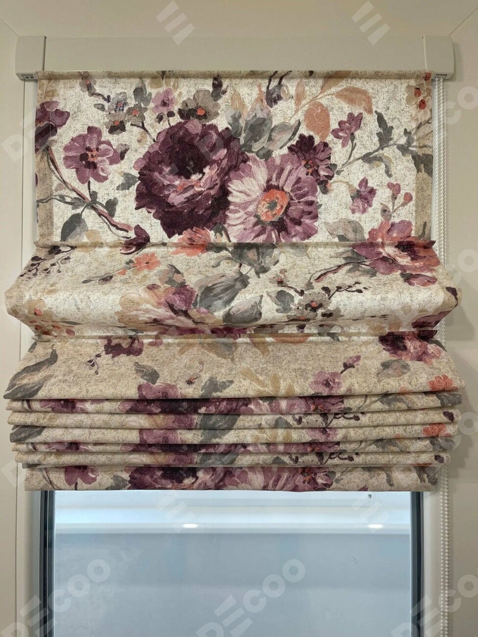 Римская штора производителя «Cortin», устанавливается на створку окна, пошита из ткани «Пионы». Штора шьётся по индивидуальным размерам, для данного типа римской шторы возможная ширина от 35 до 150 см., высота до 250 см.