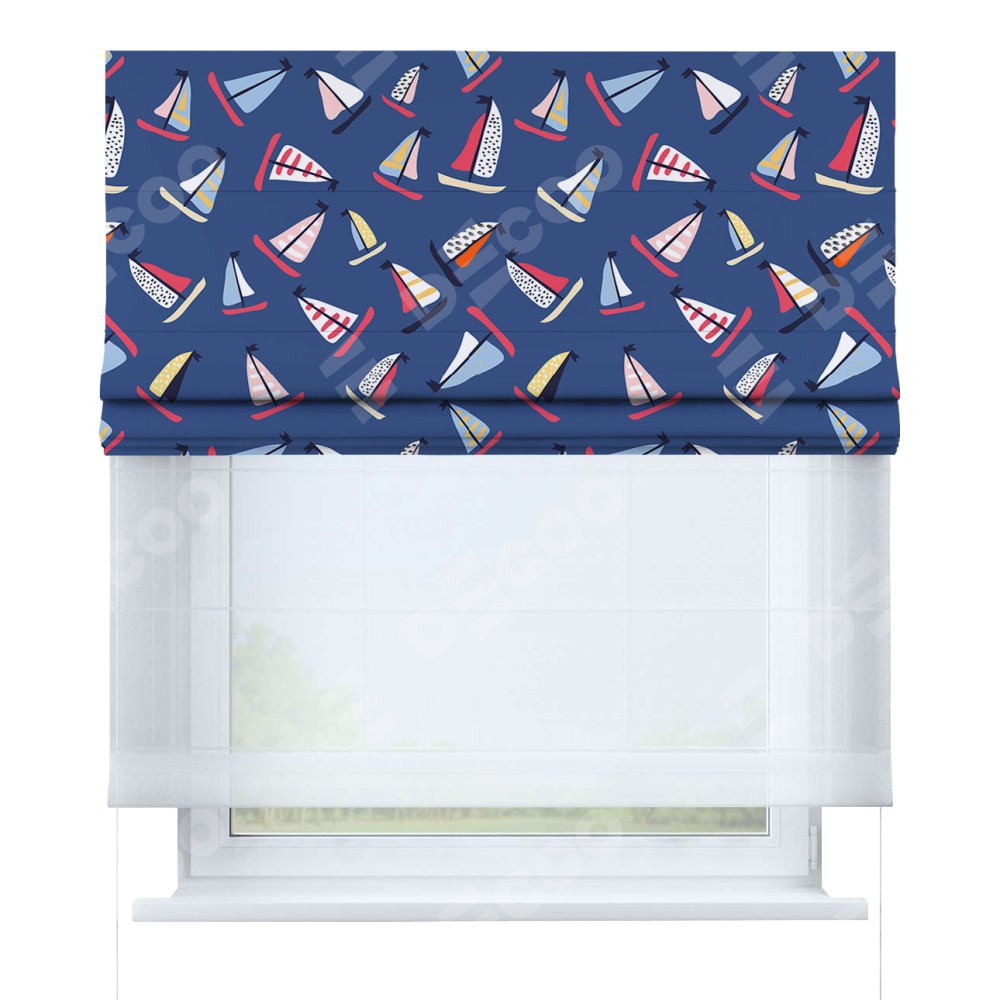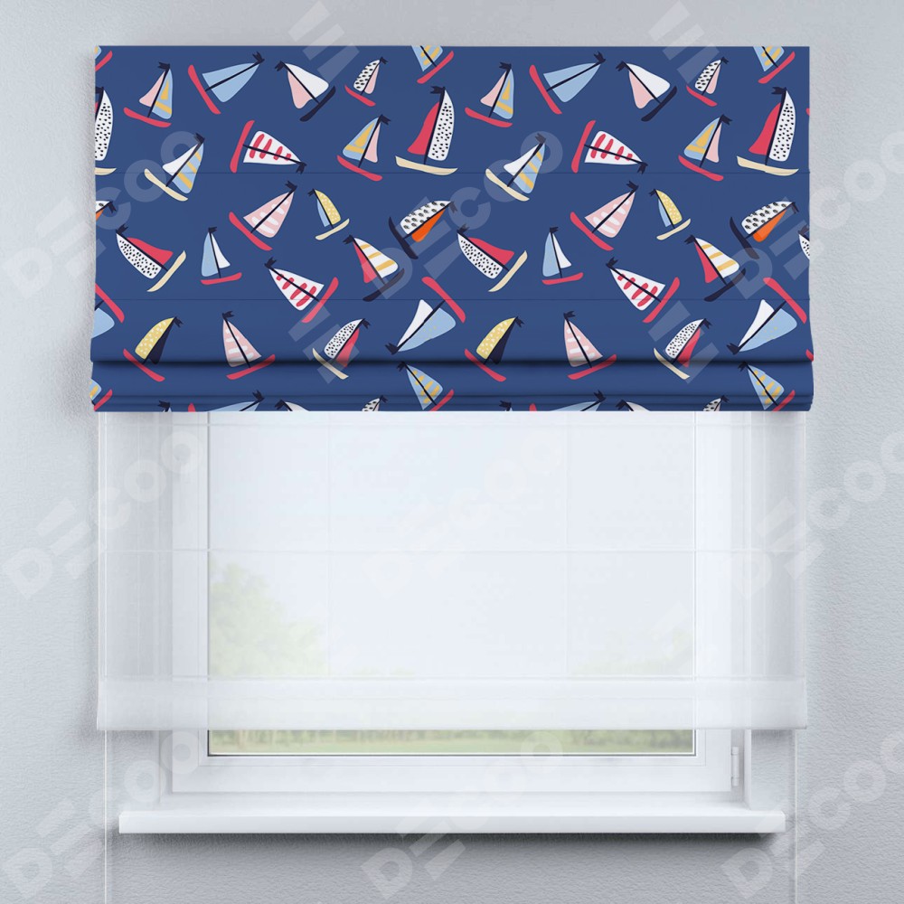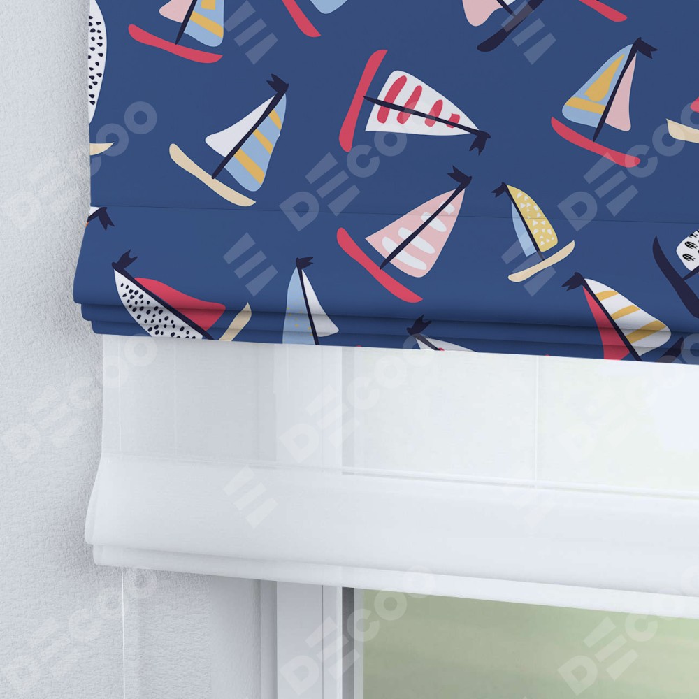 Римская штора день-ночь производителя «Cortin», используется для проёма, пошита из двух полотен, с лицевой блэкаут с нанесением сублимационной печати «Морское приключение», вторая ткань тюль (по стандарту комплектуется тюль белого цвета артикул V-01). Имеет универсальный механизм и подходит для монтажа: на потолок, на стену и в нишу.