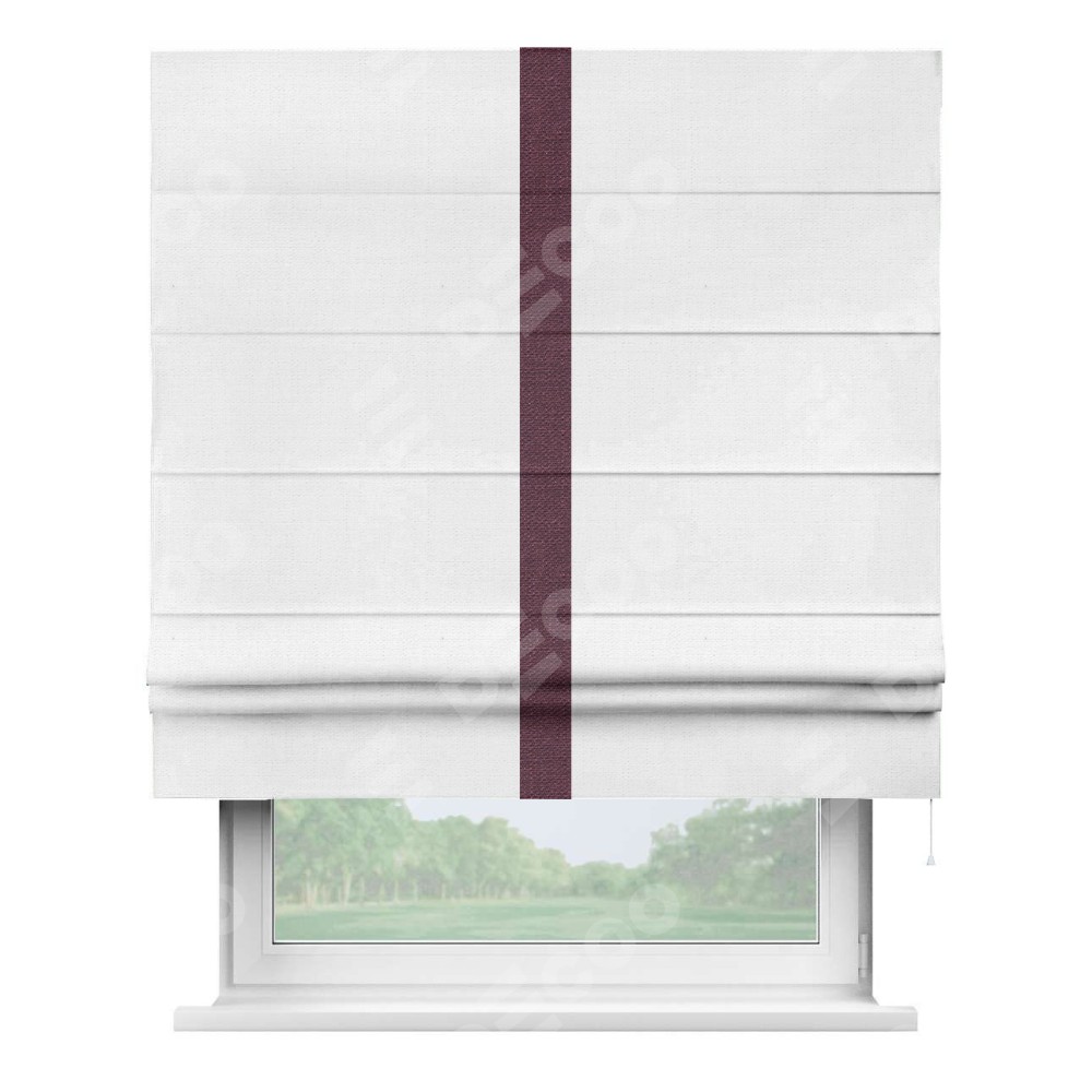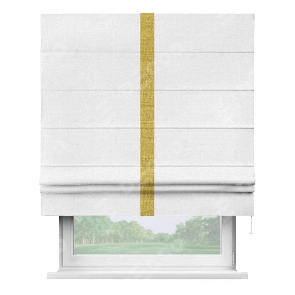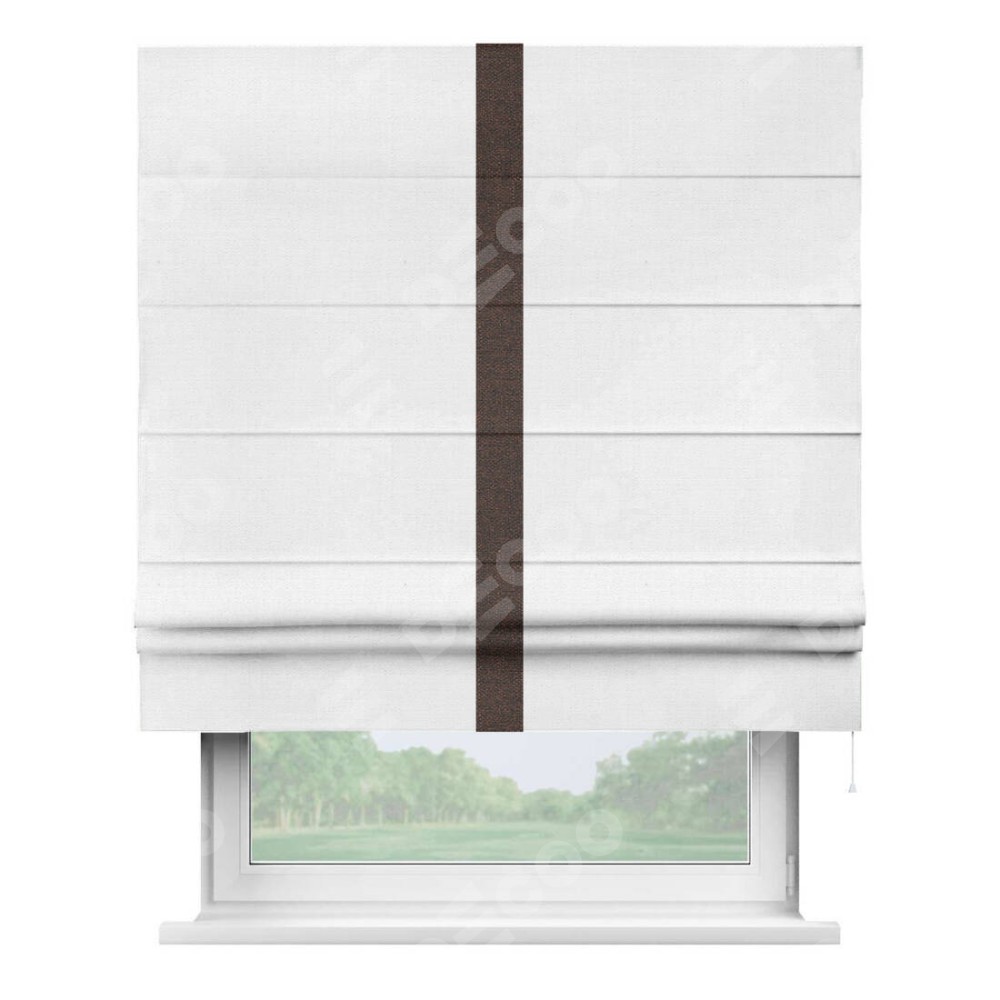 Римская штора производителя «Cortin», используется для проёма, пошита из ткани лён белый, артикул 53430. Отделка шторы кантом «Хайвэй», ткань для канта используется из льна разной расцветки на выбор. Имеет универсальный механизм и подходит для монтажа: на потолок, на стену и в нишу.