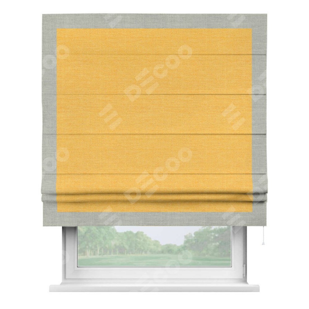 Римская штора производителя «Cortin», используется для проёма, пошита из ткани лён желтый, артикул 63738. Отделка шторы кантом «Чесс», ткань для канта используется из льна разной расцветки на выбор. Имеет универсальный механизм и подходит для монтажа: на потолок, на стену и в нишу.