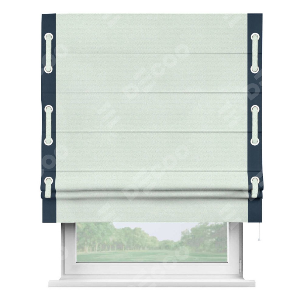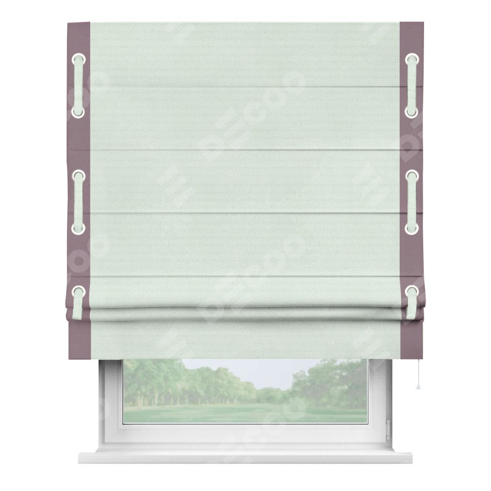 Римская штора производителя «Cortin», используется для проёма, пошита из ткани блэкаут однотонный дымчато-молочный, артикул ткани 88282. Отделка шторы кантом «Стрим Дуо» на кантах расположены люверсы с пояском, ткань для канта используется из блэкаута однотонного разной расцветки на выбор. Ткань для пояска обычно используется из основной ткани шторы, а так же можно сделать из любой расцветки по желанию. Имеет универсальный механизм и подходит для монтажа: на потолок, на стену и в нишу.