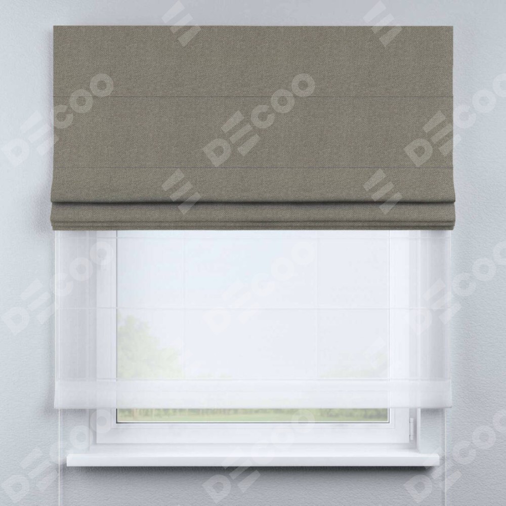 Римская штора день-ночь производителя «Cortin», используется для проёма, пошита из двух полотен, с лицевой стороны лён димаут серо-зелёный артикул 00003, вторая ткань тюль (по стандарту комплектуется тюль белого цвета артикул V-01). Имеет универсальный механизм и подходит для монтажа: на потолок, на стену и в нишу.