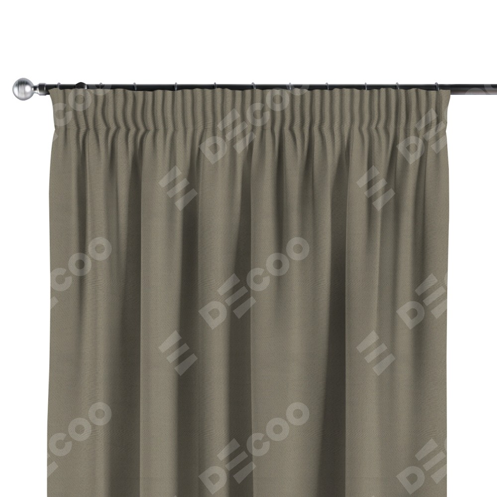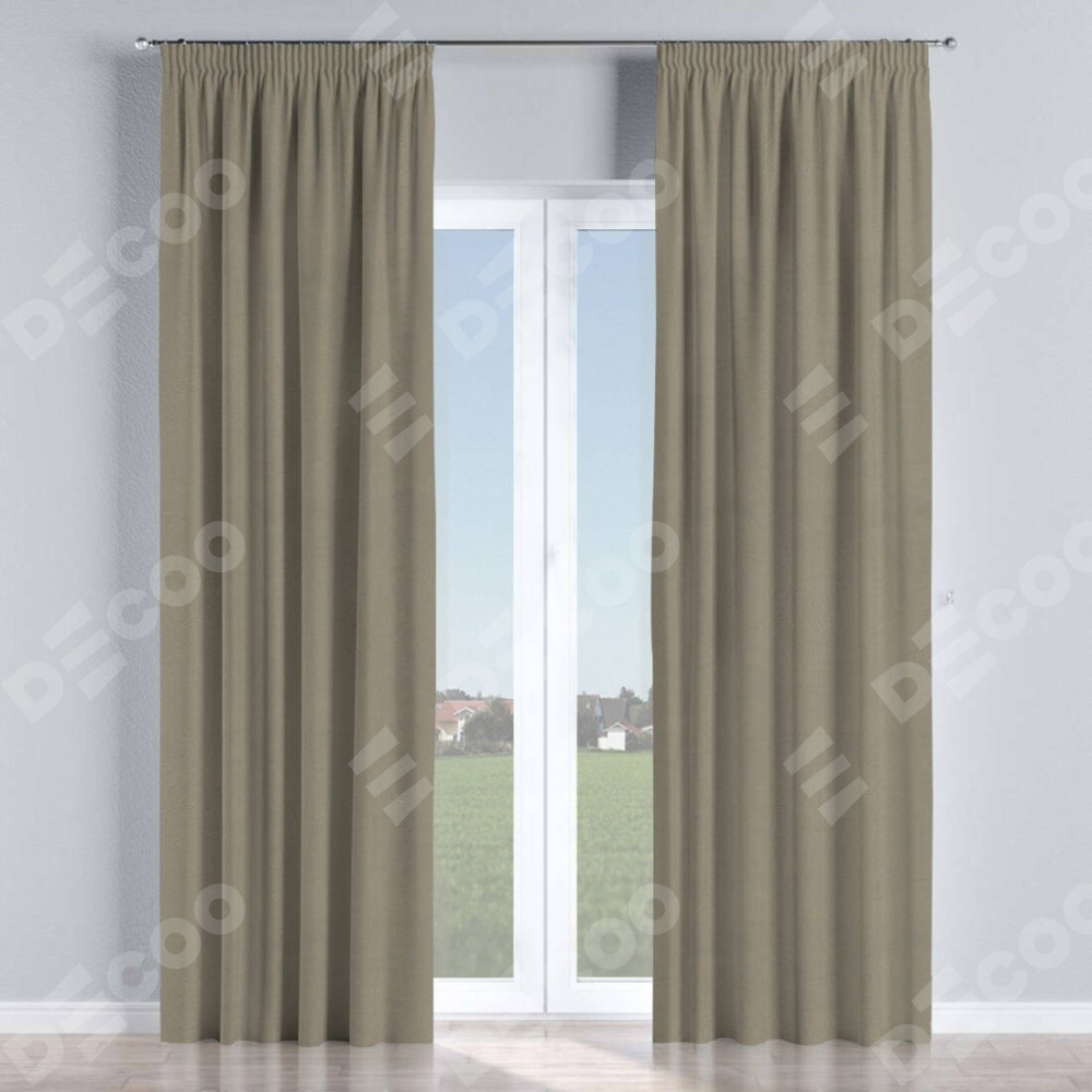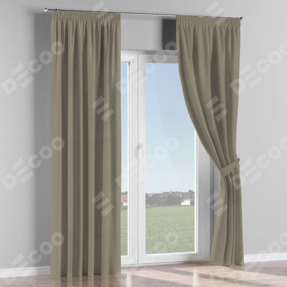 Комплект прямых штор, от производителя «Cortin», пошиты из ткани блэкаут однотонный бежево-серый, артикул ткани 00004. С изнаночной стороны в верхней части штор пристрачивается шторная лента с декоративными складками «Карандаш». Для создания элегантных складок прямые шторы шьются по стандарту с коэффициентом 1:2 (на 100 см. ширины проёма 200 см. ширины ткани).