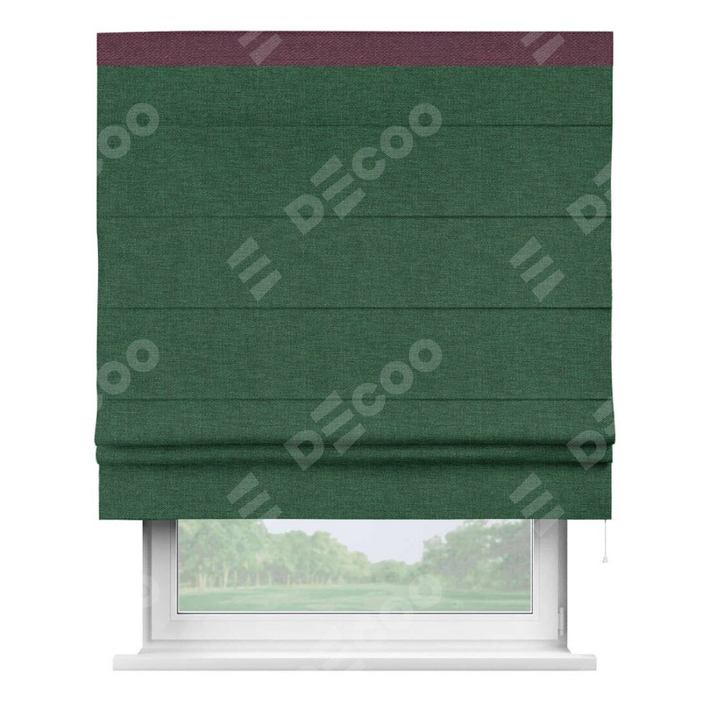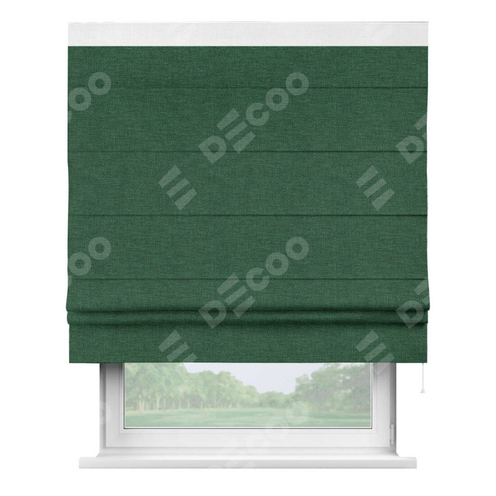 Римская штора производителя «Cortin», используется для проёма, пошита из ткани лён серо-зеленый, артикул 63740. Отделка шторы кантом «Кинг», ткань для канта используется из льна разной расцветки на выбор. Имеет универсальный механизм и подходит для монтажа: на потолок, на стену и в нишу.