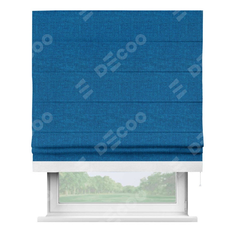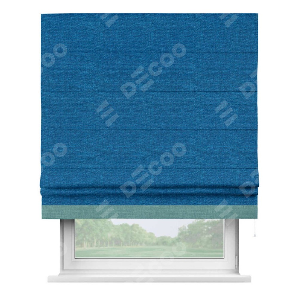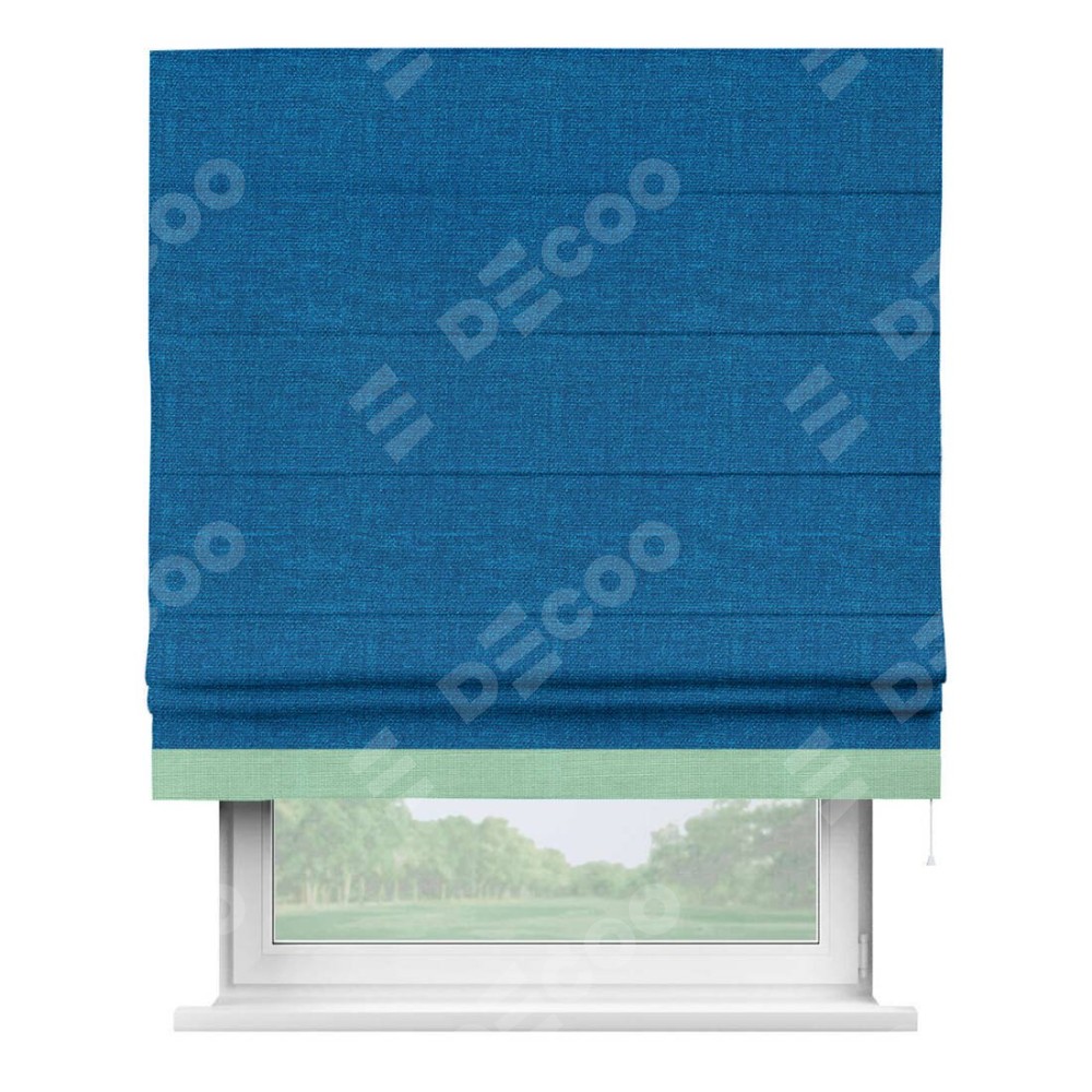 Римская штора производителя «Cortin», используется для проёма, пошита из ткани лён синий, артикул 63742. Отделка шторы кантом «Джестер», ткань для канта используется из льна разной расцветки на выбор. Имеет универсальный механизм и подходит для монтажа: на потолок, на стену и в нишу.