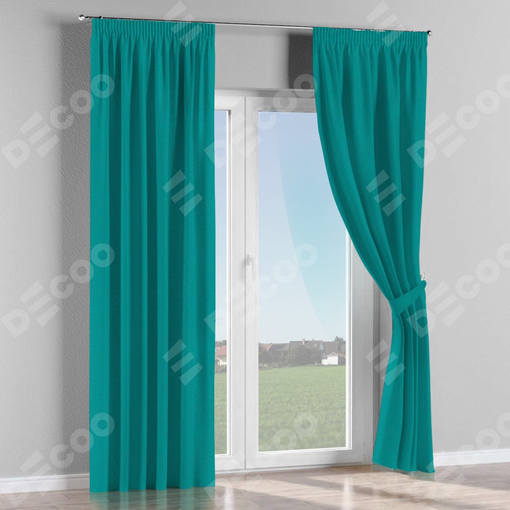 Комплект прямых штор, от производителя «Cortin», пошиты из ткани лён димаут тёмно-бирюзовый, артикул ткани 318. С изнаночной стороны в верхней части штор пристрачивается шторная лента с декоративными складками «Карандаш». Для создания элегантных складок прямые шторы шьются по стандарту с коэффициентом 1:2 (на 100 см. ширины проёма 200 см. ширины ткани).