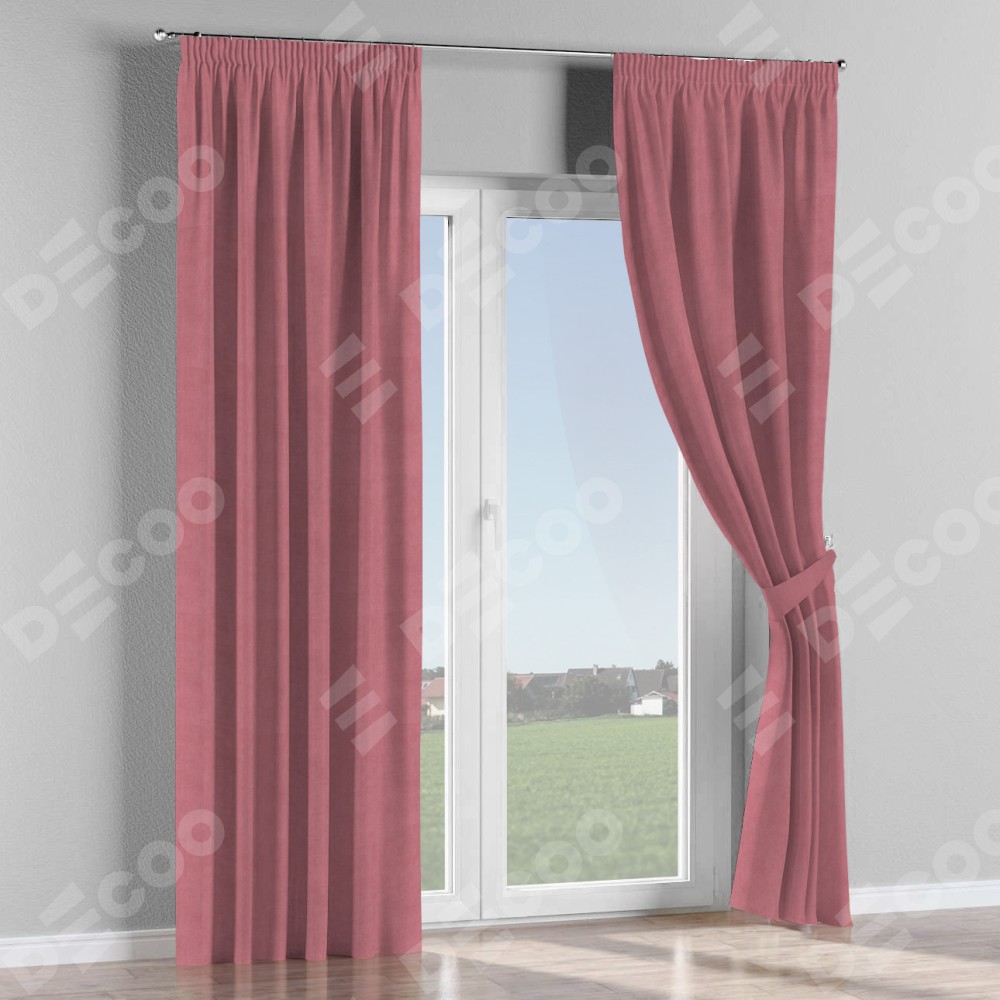 Комплект прямых штор, от производителя «Cortin», пошиты из ткани вельвет брусника, артикул ткани 85550. С изнаночной стороны в верхней части штор пристрачивается шторная лента с декоративными складками «Карандаш». Для создания элегантных складок прямые шторы шьются по стандарту с коэффициентом 1:2 (на 100 см. ширины проёма 200 см. ширины ткани).
