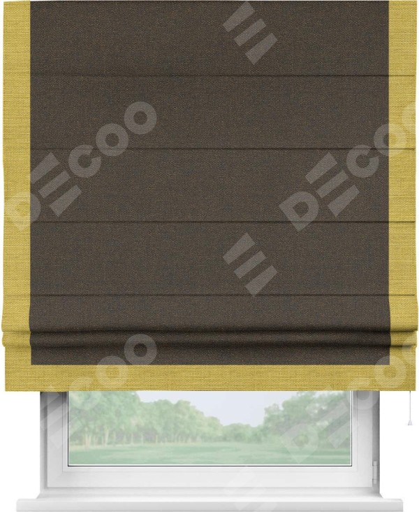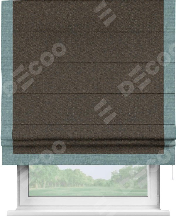 Римская штора производителя «Cortin», используется для проёма, пошита из ткани лён темно-коричневый, артикул 53444. Отделка шторы кантом «Виктория», ткань для канта используется из льна разной расцветки на выбор. Имеет универсальный механизм и подходит для монтажа: на потолок, на стену и в нишу.
