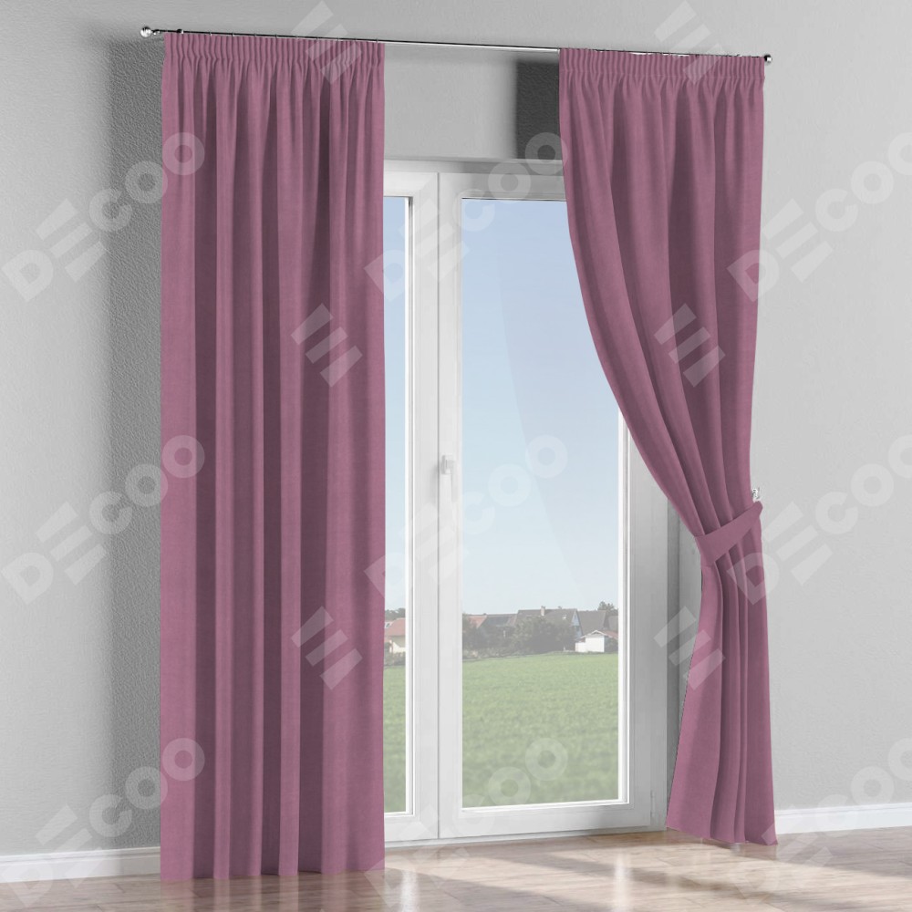 Комплект прямых штор, от производителя «Cortin», пошиты из ткани вельвет лиловый, артикул ткани 17752. С изнаночной стороны в верхней части штор пристрачивается шторная лента с декоративными складками «Карандаш». Для создания элегантных складок прямые шторы шьются по стандарту с коэффициентом 1:2 (на 100 см. ширины проёма 200 см. ширины ткани).
