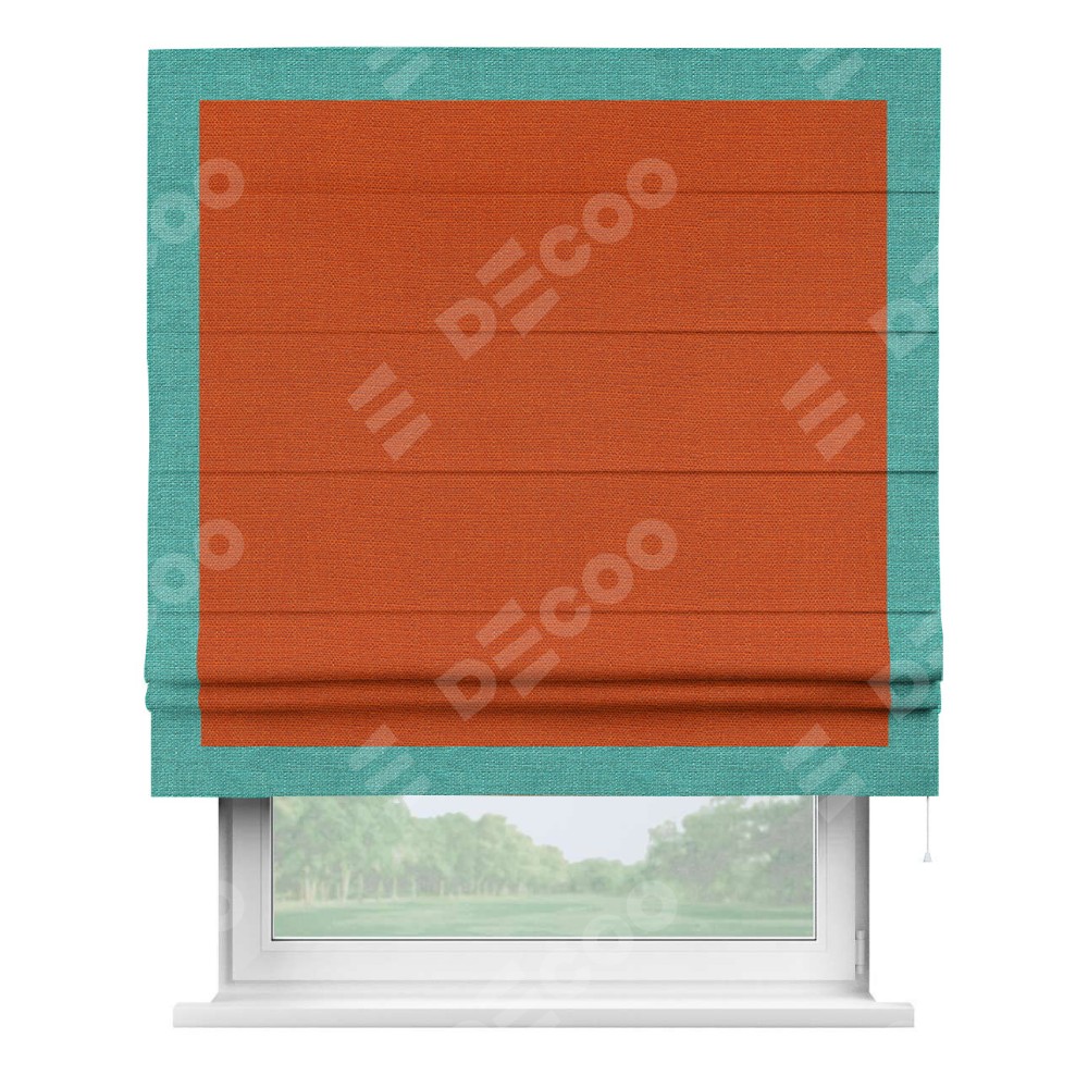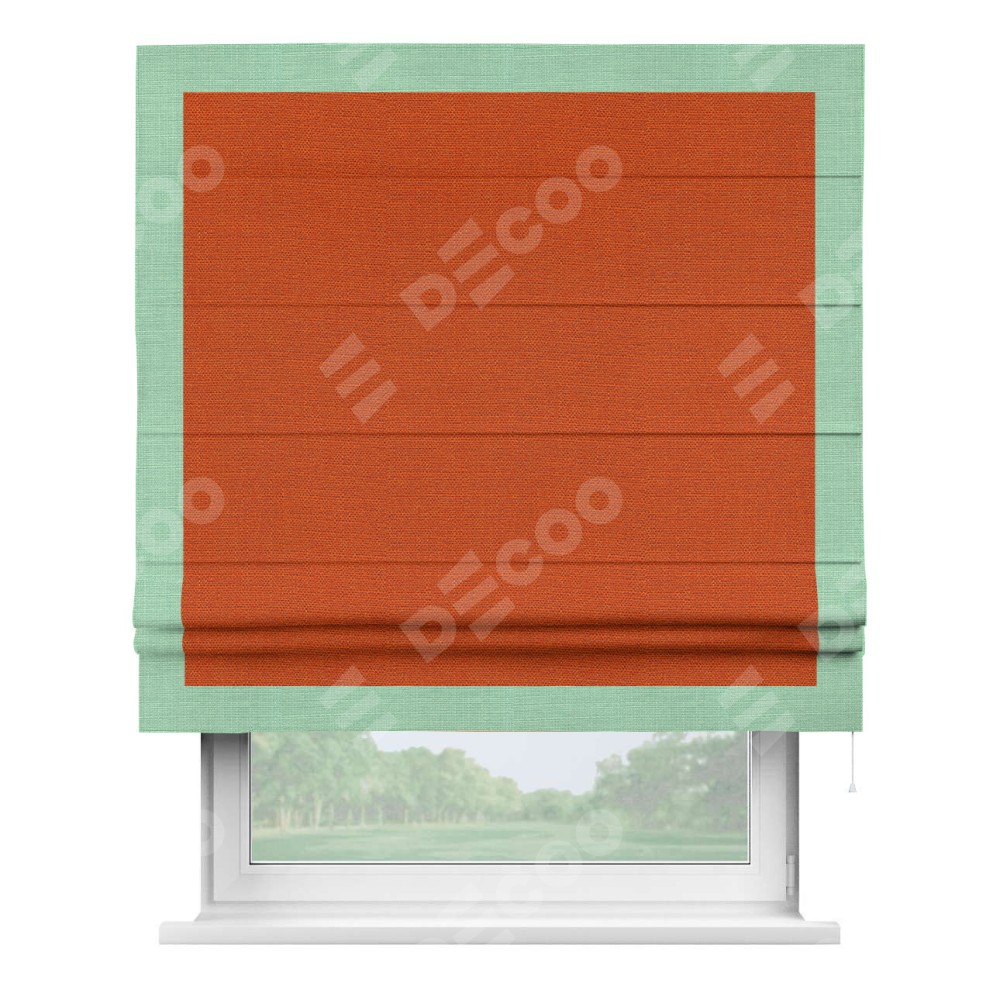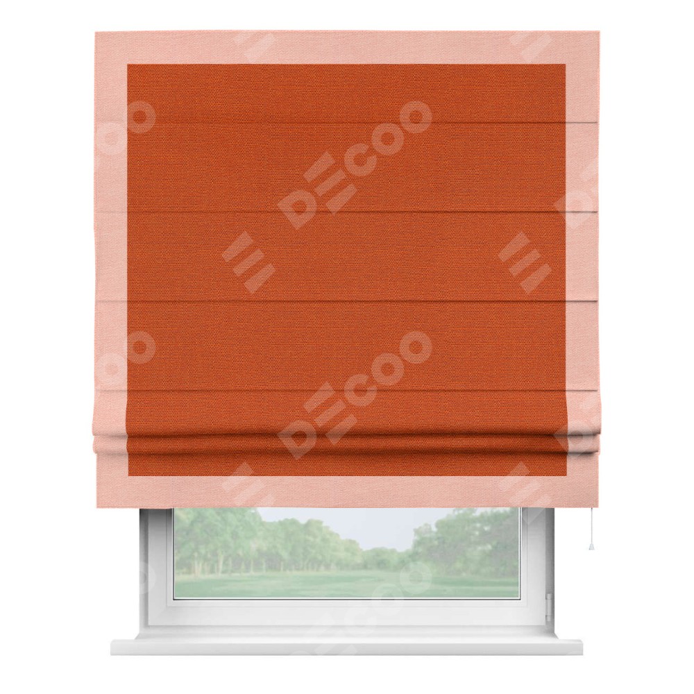 Римская штора производителя «Cortin», используется для проёма, пошита из ткани лён терракотовый, артикул 53440. Отделка шторы кантом «Чесс», ткань для канта используется из льна разной расцветки на выбор. Имеет универсальный механизм и подходит для монтажа: на потолок, на стену и в нишу.