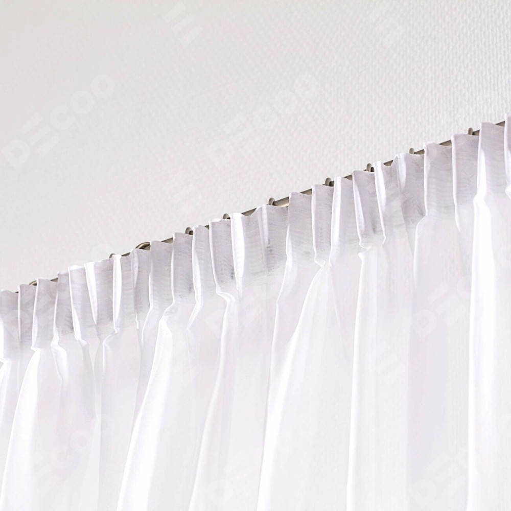 Комплект прямых штор, от производителя «Cortin», пошиты из ткани тюль белый, артикул ткани V-01. С изнаночной стороны в верхней части штор пристрачивается шторная лента с декоративными складками «Карандаш». Для создания элегантных складок прямые шторы шьются по стандарту с коэффициентом 1:2 (на 100 см. ширины проёма 200 см. ширины ткани).