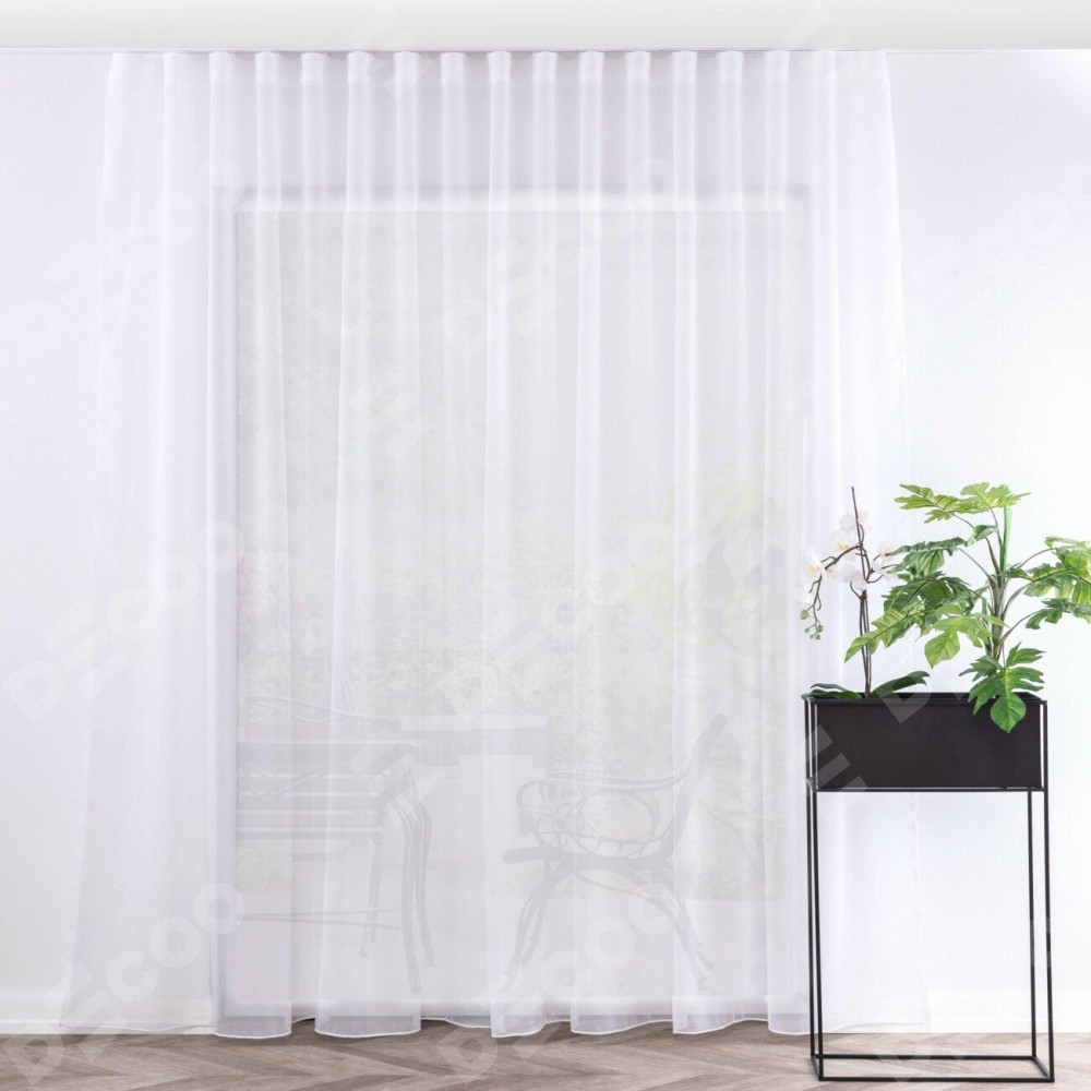 Комплект прямых штор, от производителя «Cortin», пошиты из ткани тюль белый, артикул ткани V-01. С изнаночной стороны в верхней части штор пристрачивается шторная лента с декоративными складками «Волна». Для создания элегантных складок прямые шторы шьются по стандарту с коэффициентом 1:2 (на 100 см. ширины проёма 200 см. ширины ткани).