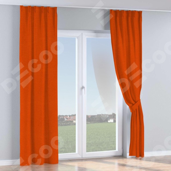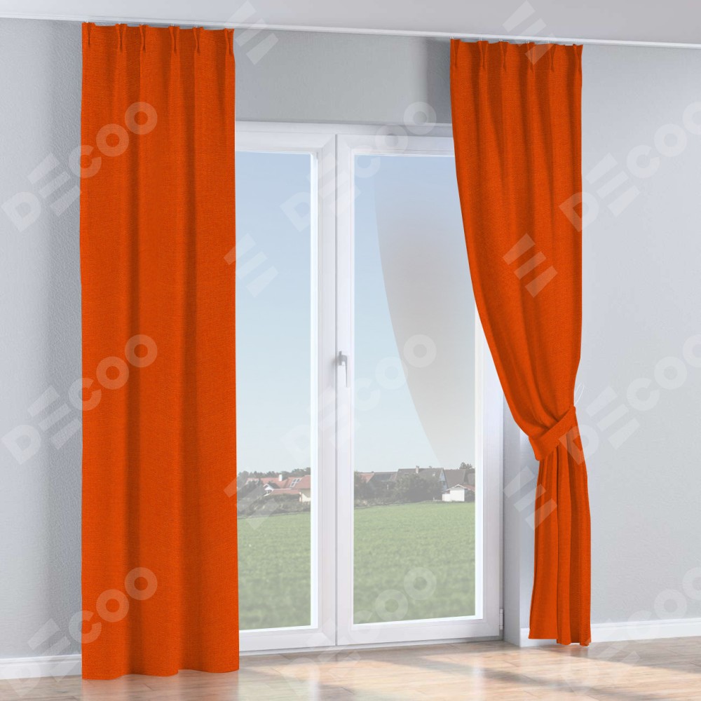 Комплект прямых штор, от производителя «Cortin», пошиты из ткани лён терракотовый, артикул ткани 53440. С изнаночной стороны в верхней части штор пристрачивается шторная лента с декоративными складками «Кустик». Для создания элегантных складок прямые шторы шьются по стандарту с коэффициентом 1:2 (на 100 см. ширины проёма 200 см. ширины ткани).