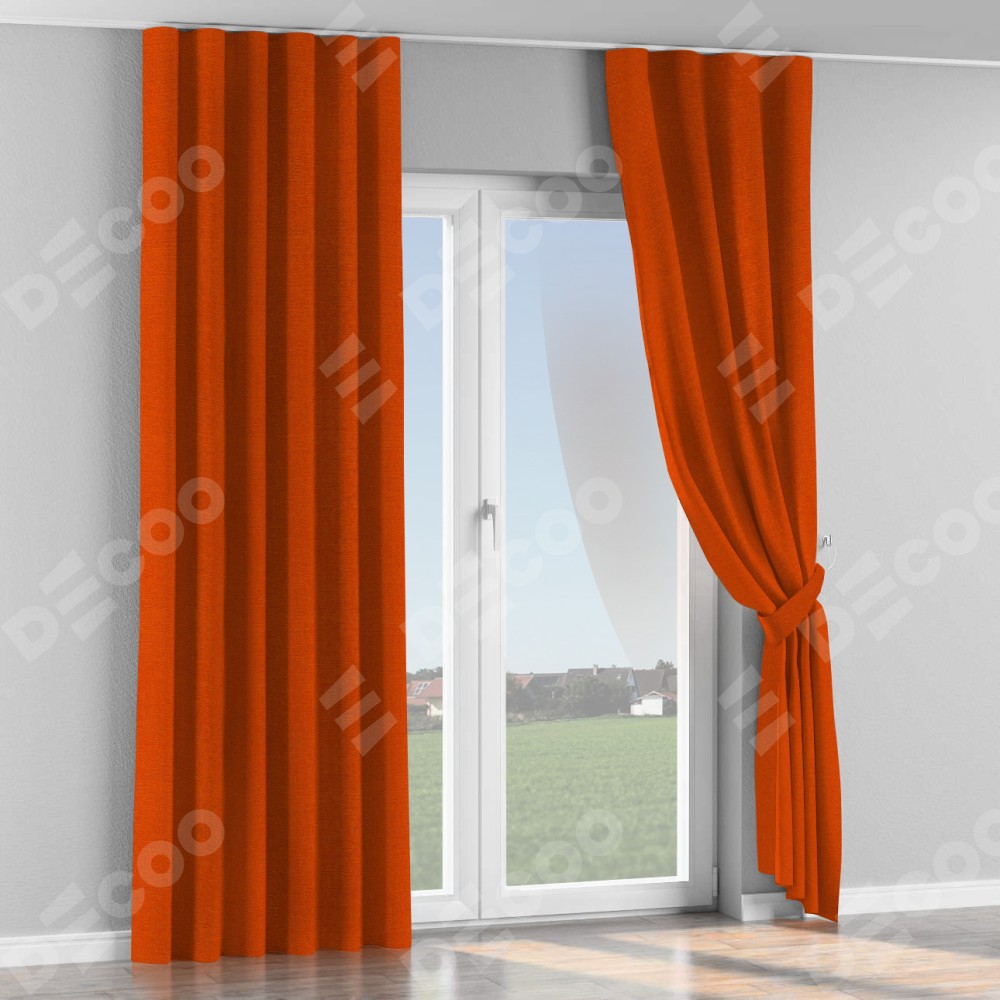 Комплект прямых штор, от производителя «Cortin», пошиты из ткани лён терракотовый, артикул ткани 53440. С изнаночной стороны в верхней части штор пристрачивается шторная лента с декоративными складками «Волна». Для создания элегантных складок прямые шторы шьются по стандарту с коэффициентом 1:2 (на 100 см. ширины проёма 200 см. ширины ткани).