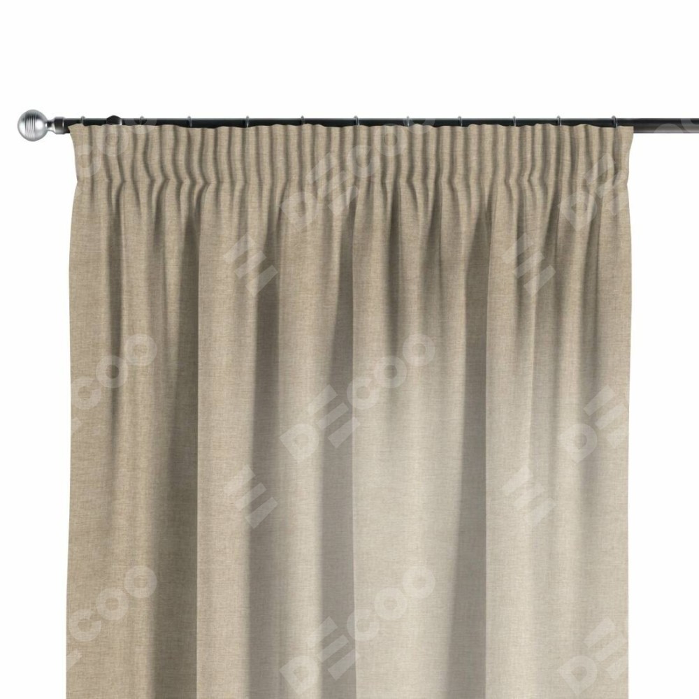 Комплект прямых штор, от производителя «Cortin», пошиты из ткани лён кашемир бежевый, артикул ткани 17206. С изнаночной стороны в верхней части штор пристрачивается шторная лента с декоративными складками «Карандаш». Для создания элегантных складок прямые шторы шьются по стандарту с коэффициентом 1:2 (на 100 см. ширины проёма 200 см. ширины ткани).