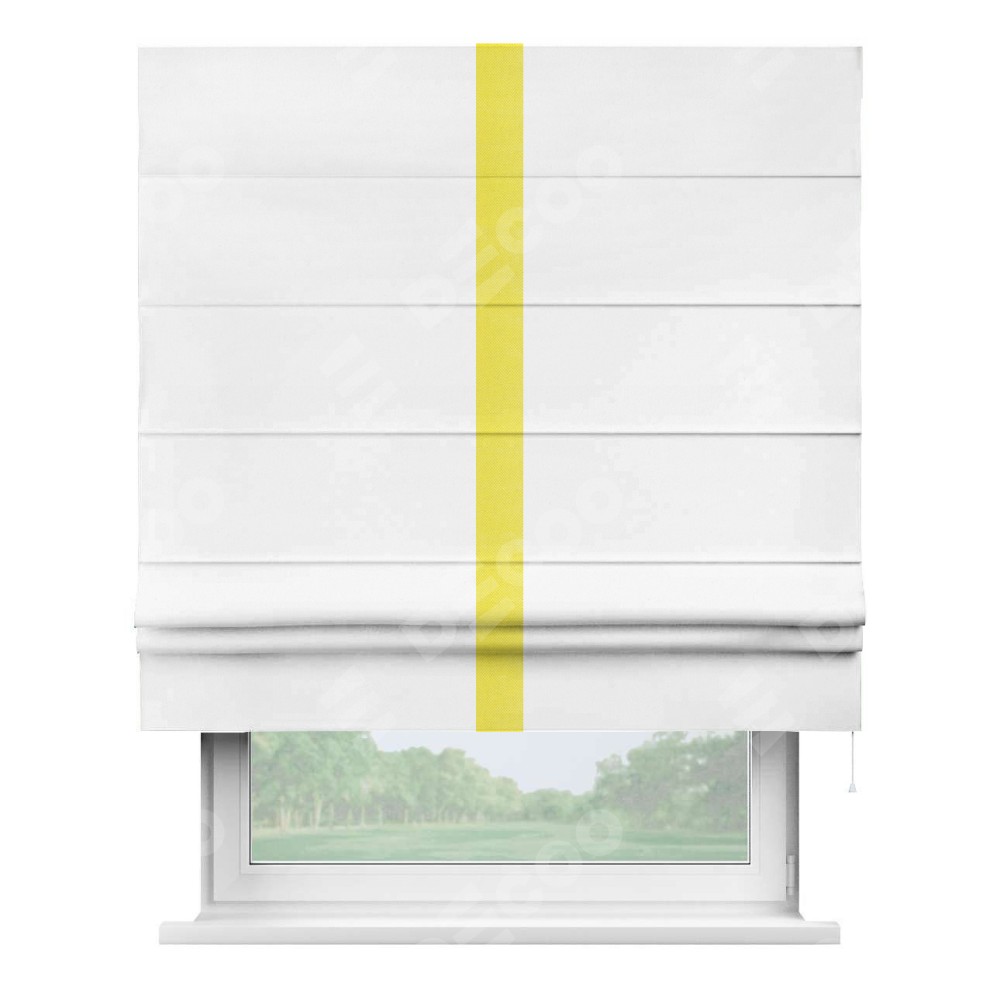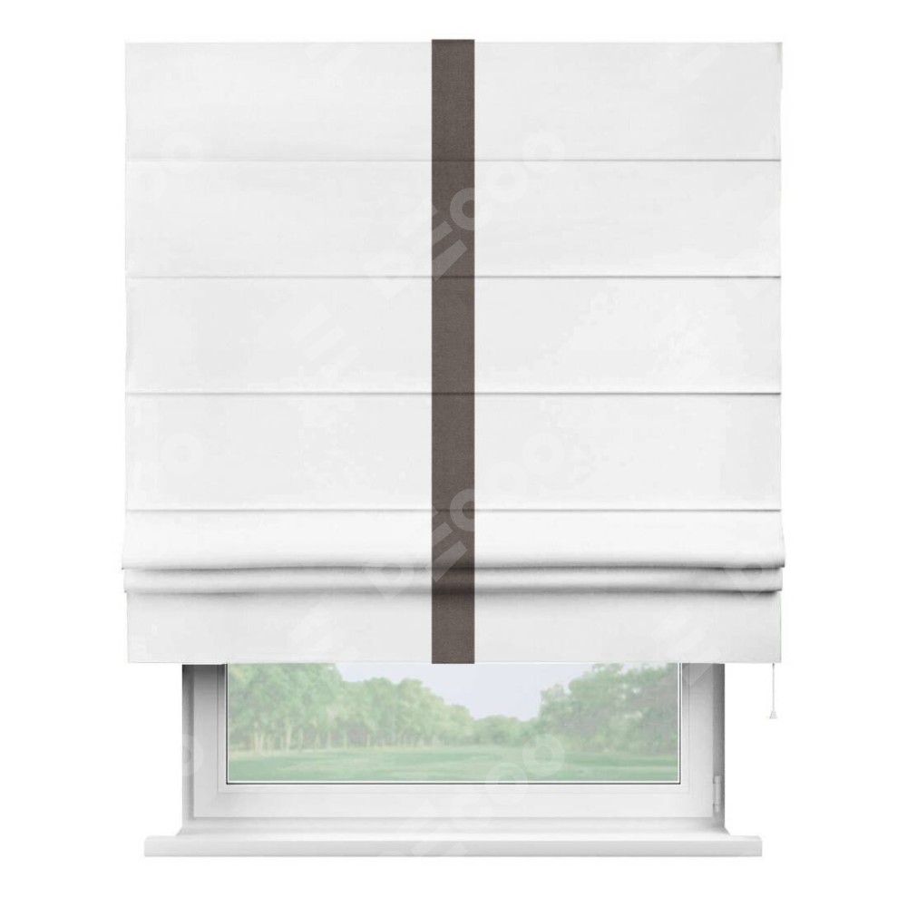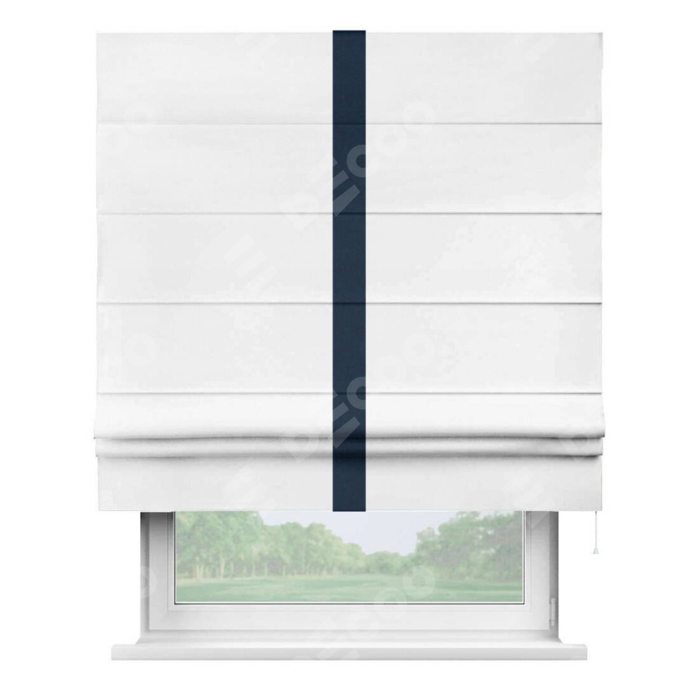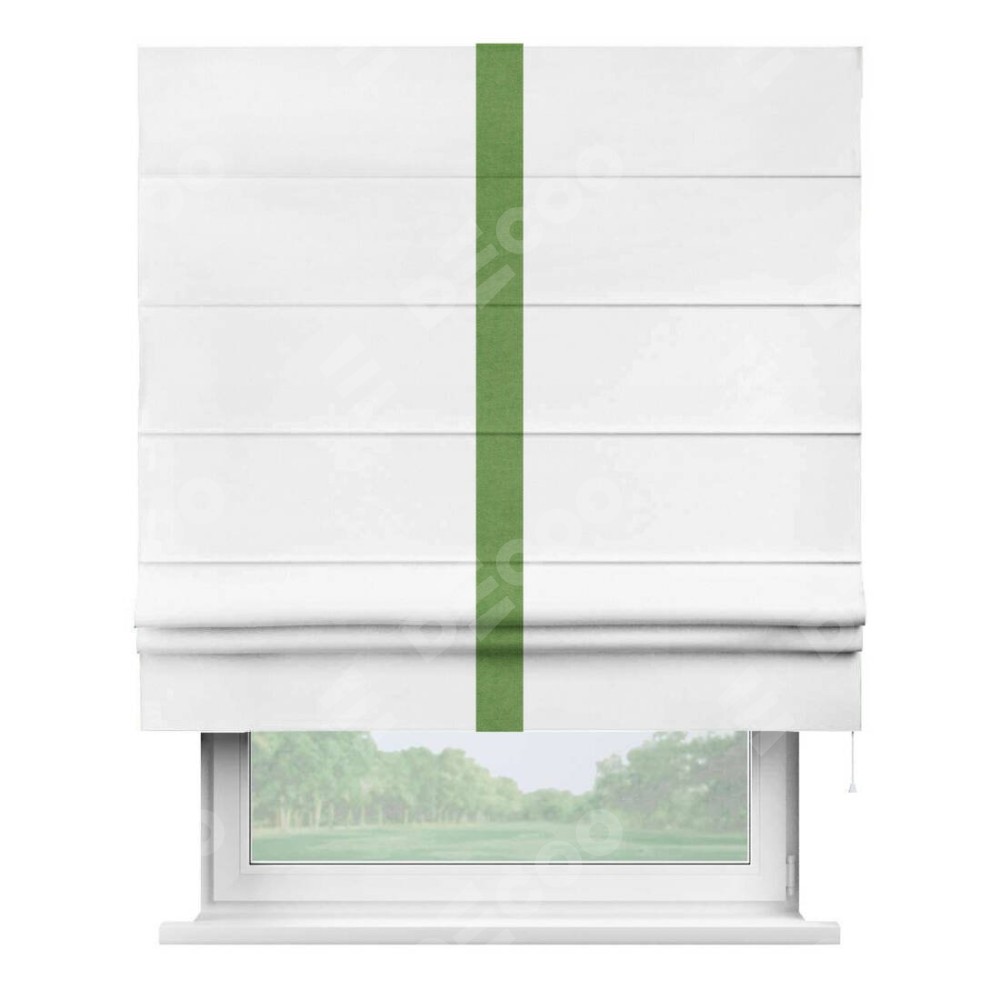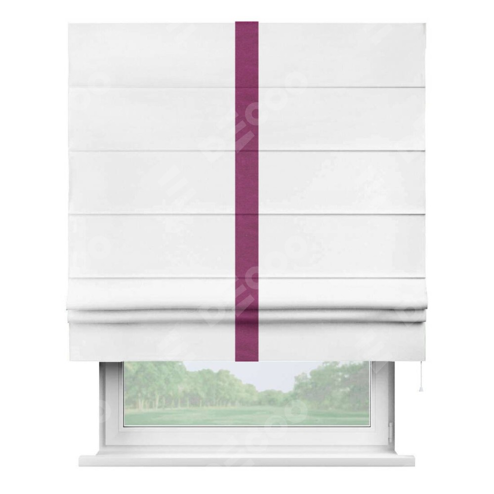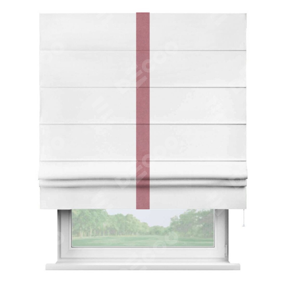 Римская штора производителя «Cortin», используется для проёма, пошита из ткани вельвет белый, артикул ткани 10810. Отделка шторы кантом «Хайвей», ткань для канта используется из вельвета разной расцветки на выбор. Имеет универсальный механизм и подходит для монтажа: на потолок, на стену и в нишу.