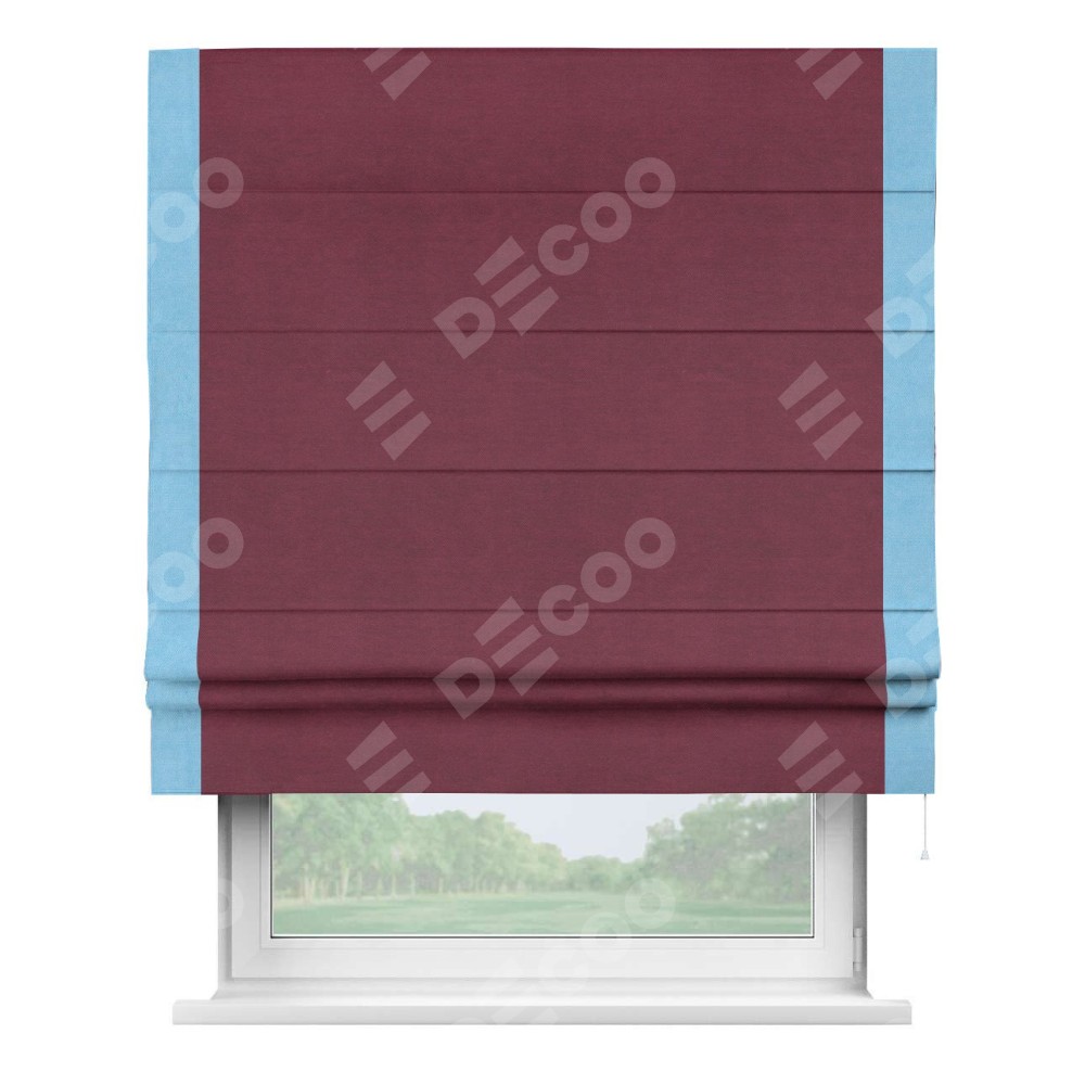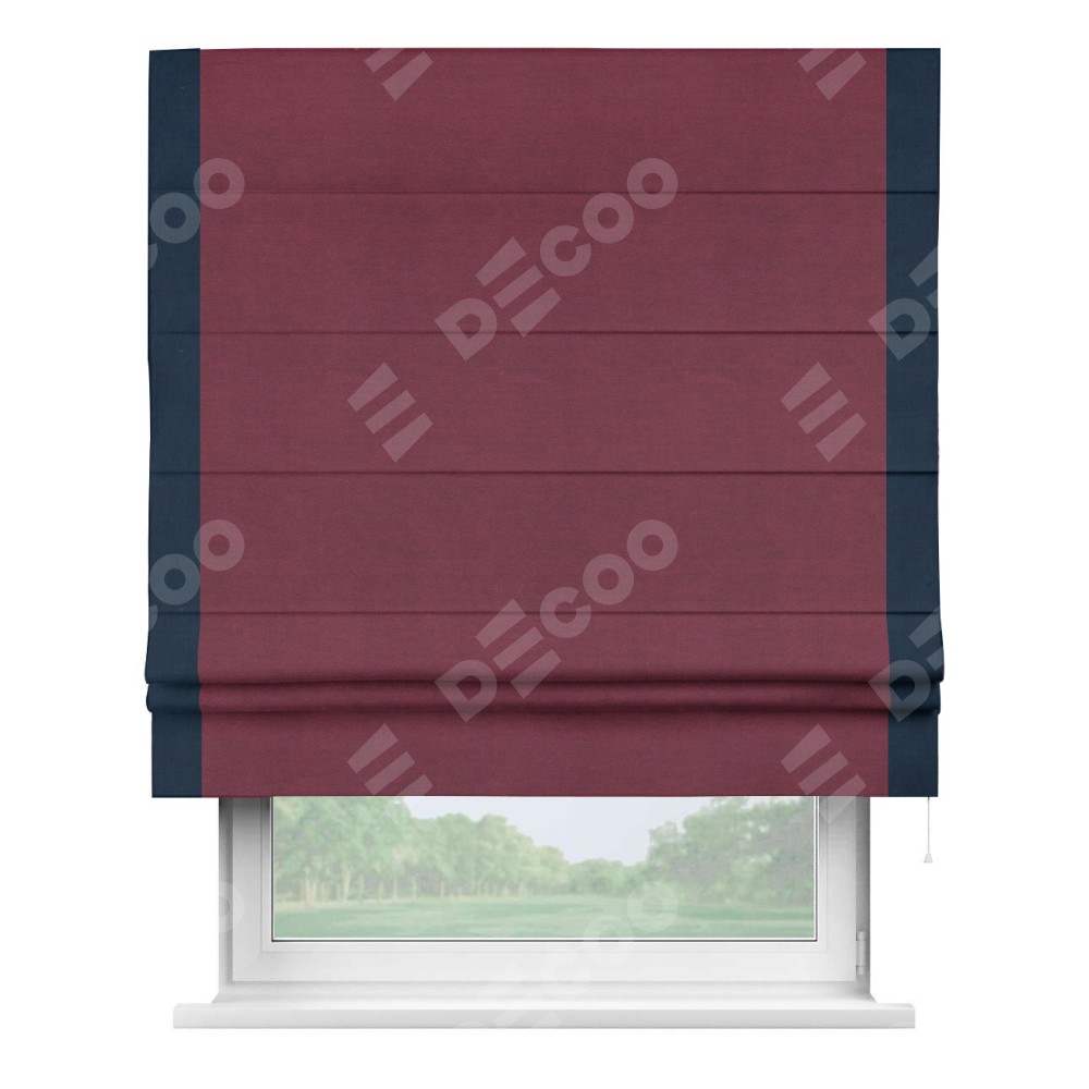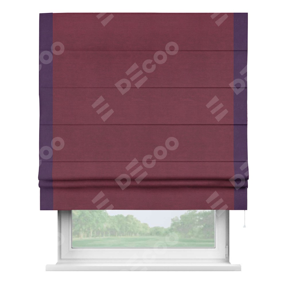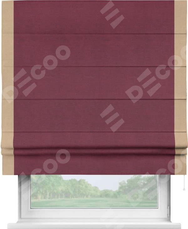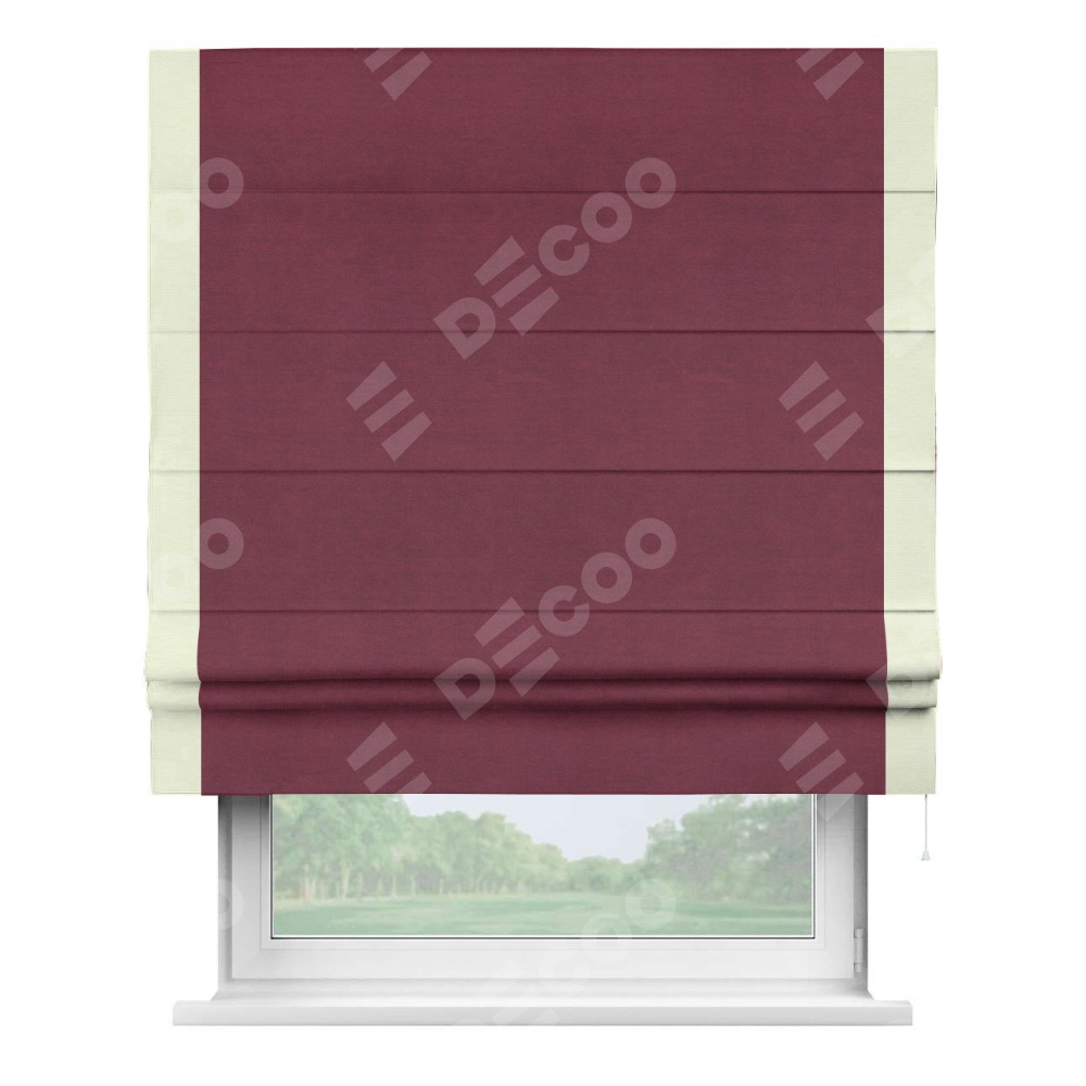 Римская штора производителя «Cortin», используется для проёма, пошита из ткани вельвет бордовый, артикул ткани 85553. Отделка шторы кантом «Стрим Дуо», ткань для канта используется из вельвета разной расцветки на выбор. Имеет универсальный механизм и подходит для монтажа: на потолок, на стену и в нишу.