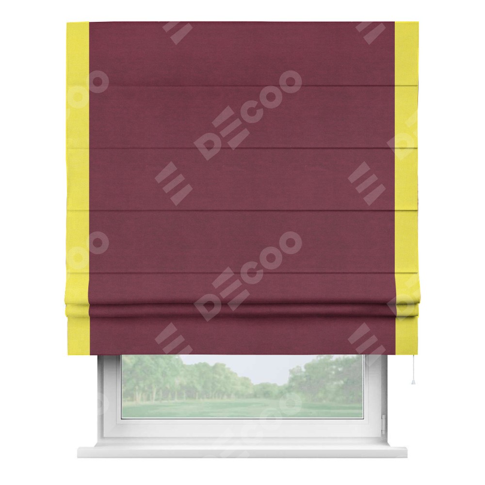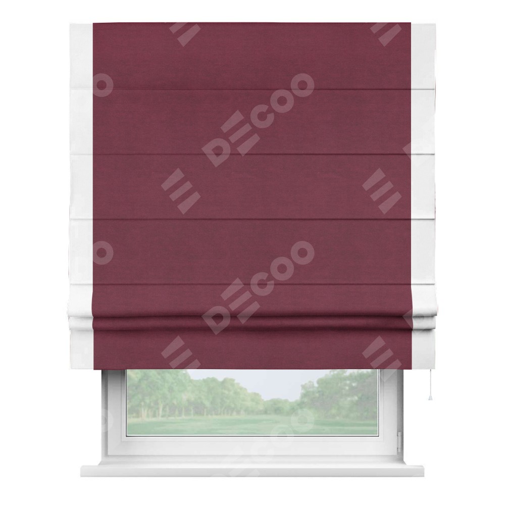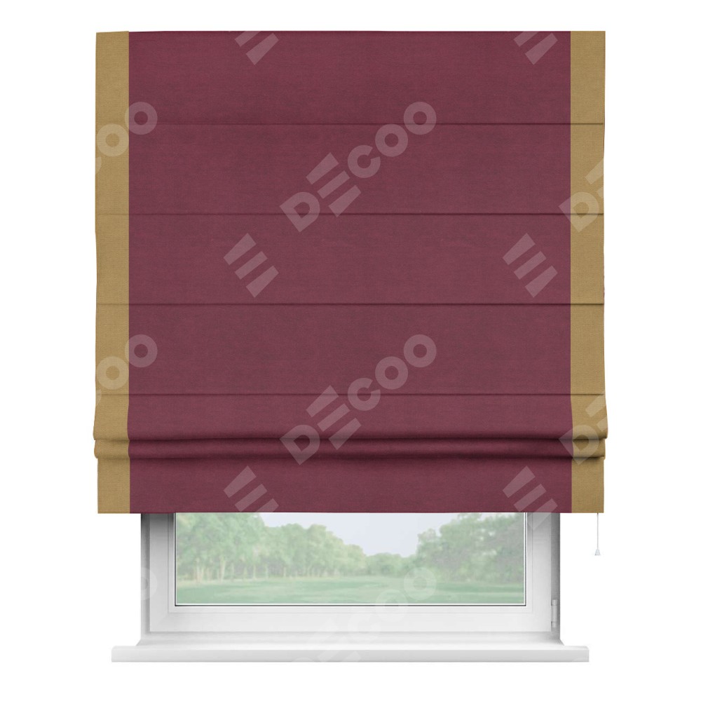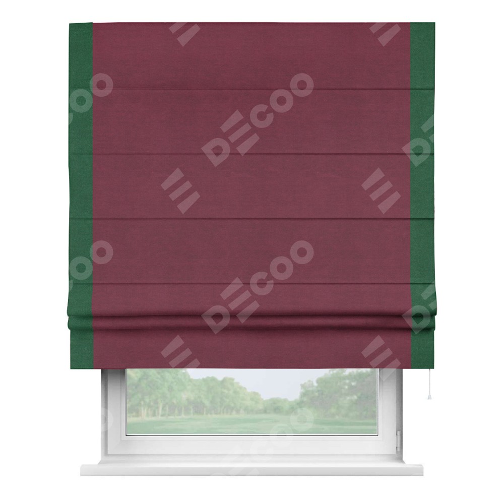 Римская штора производителя «Cortin», используется для проёма, пошита из ткани вельвет бордовый, артикул ткани 85553. Отделка шторы кантом «Стрим Дуо», ткань для канта используется из вельвета разной расцветки на выбор. Имеет универсальный механизм и подходит для монтажа: на потолок, на стену и в нишу.