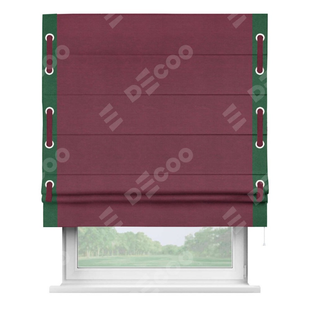 Римская штора производителя «Cortin», используется для проёма, пошита из ткани вельвет бордовый, артикул ткани 85553. Отделка шторы кантом «Стрим Дуо» на кантах расположены люверсы с пояском, ткань для канта используется из вельвета разной расцветки на выбор. Ткань для пояска обычно используется из основной ткани шторы, а так же можно сделать из любой расцветки по желанию. Имеет универсальный механизм и подходит для монтажа: на потолок, на стену и в нишу.