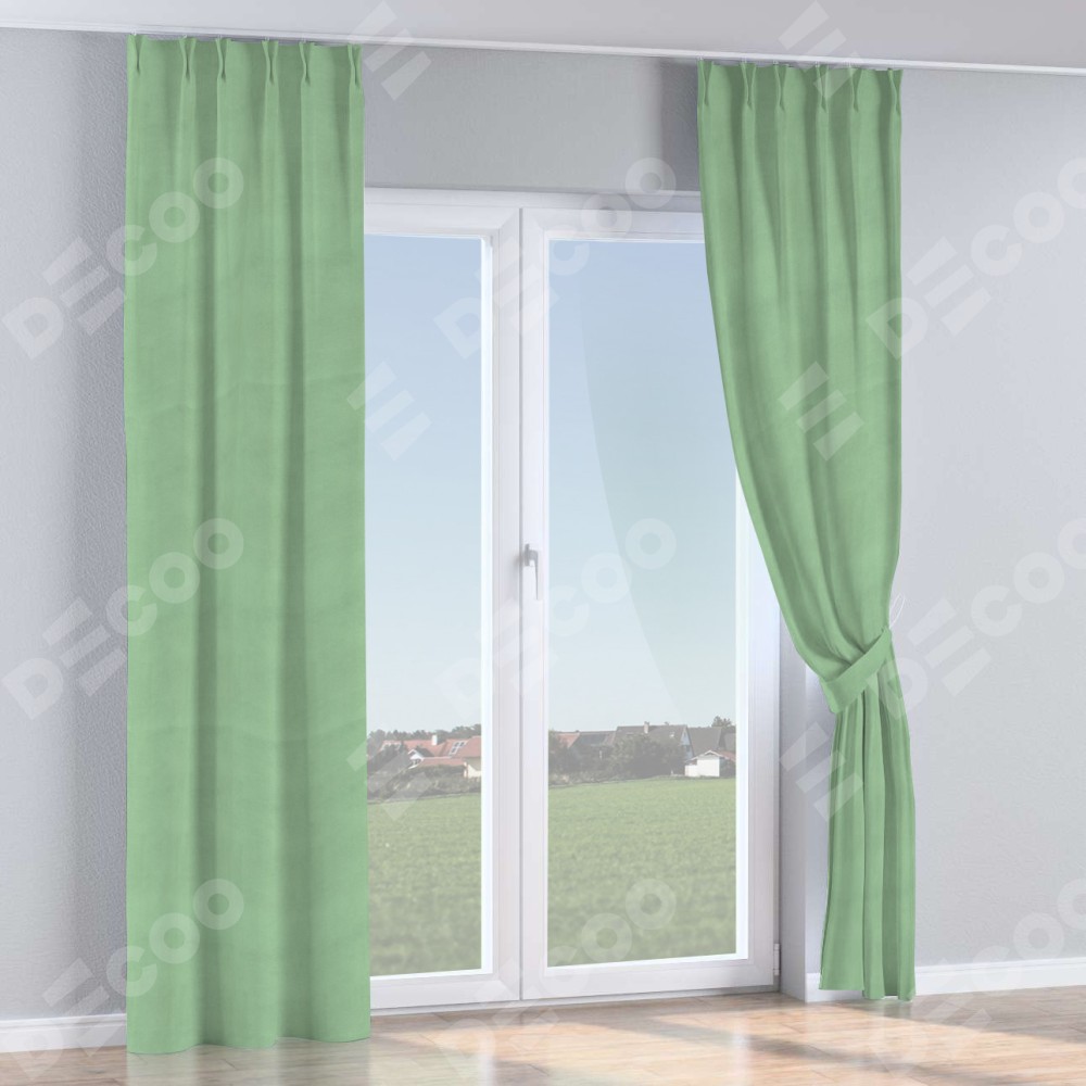 Комплект прямых штор, от производителя «Cortin», пошиты из ткани бархат оливковый, артикул ткани 18746. С изнаночной стороны в верхней части штор пристрачивается шторная лента с декоративными складками «Кустик». Для создания элегантных складок прямые шторы шьются по стандарту с коэффициентом 1:2 (на 100 см. ширины проёма 200 см. ширины ткани).