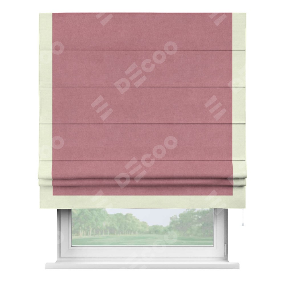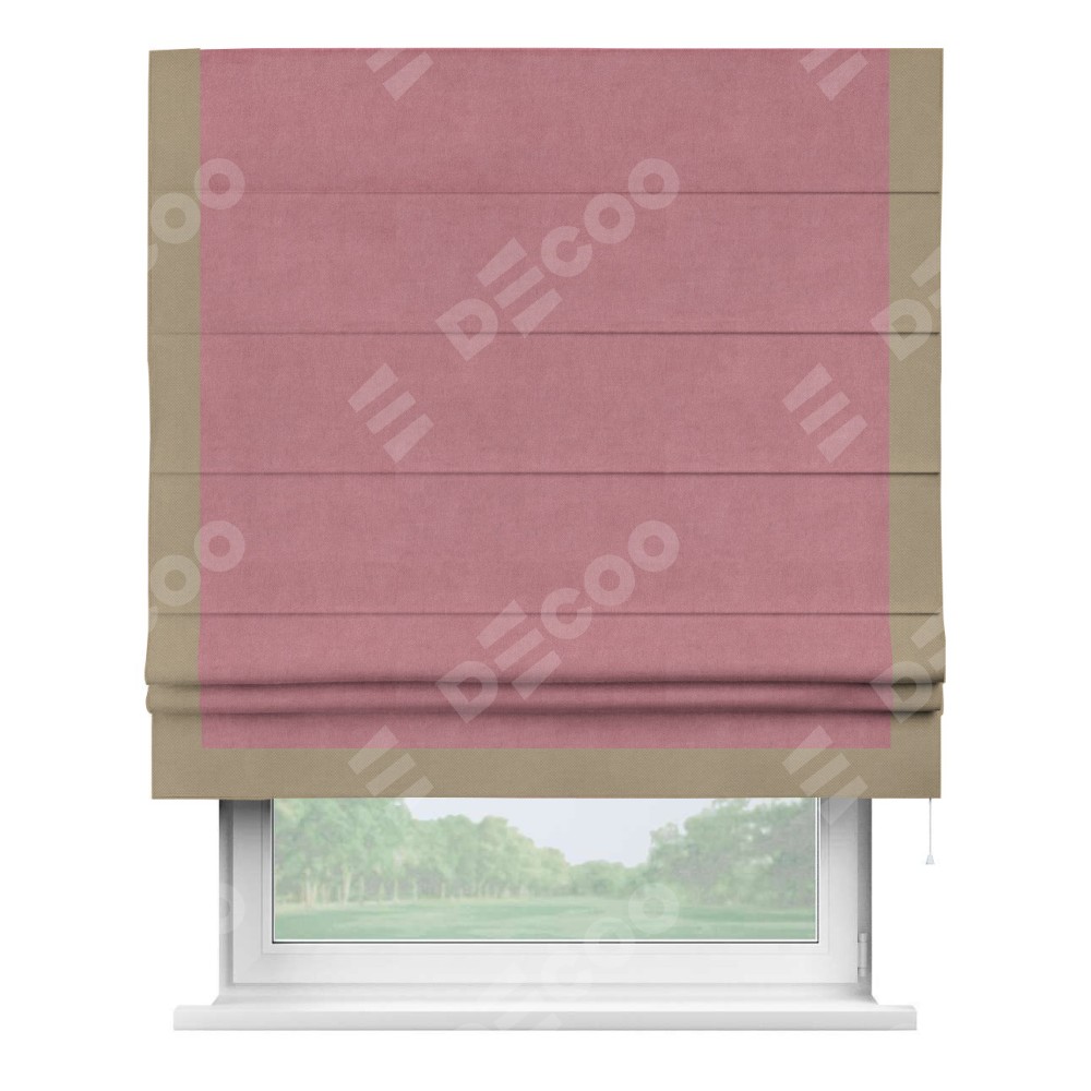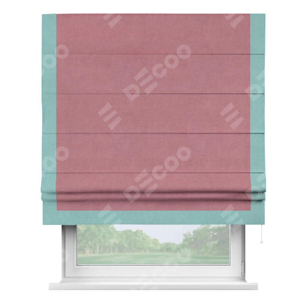 Римская штора производителя «Cortin», используется для проёма, пошита из ткани вельвет брусника, артикул ткани 85550. Отделка шторы кантом «Виктория», ткань для канта используется из вельвета разной расцветки на выбор. Имеет универсальный механизм и подходит для монтажа: на потолок, на стену и в нишу.