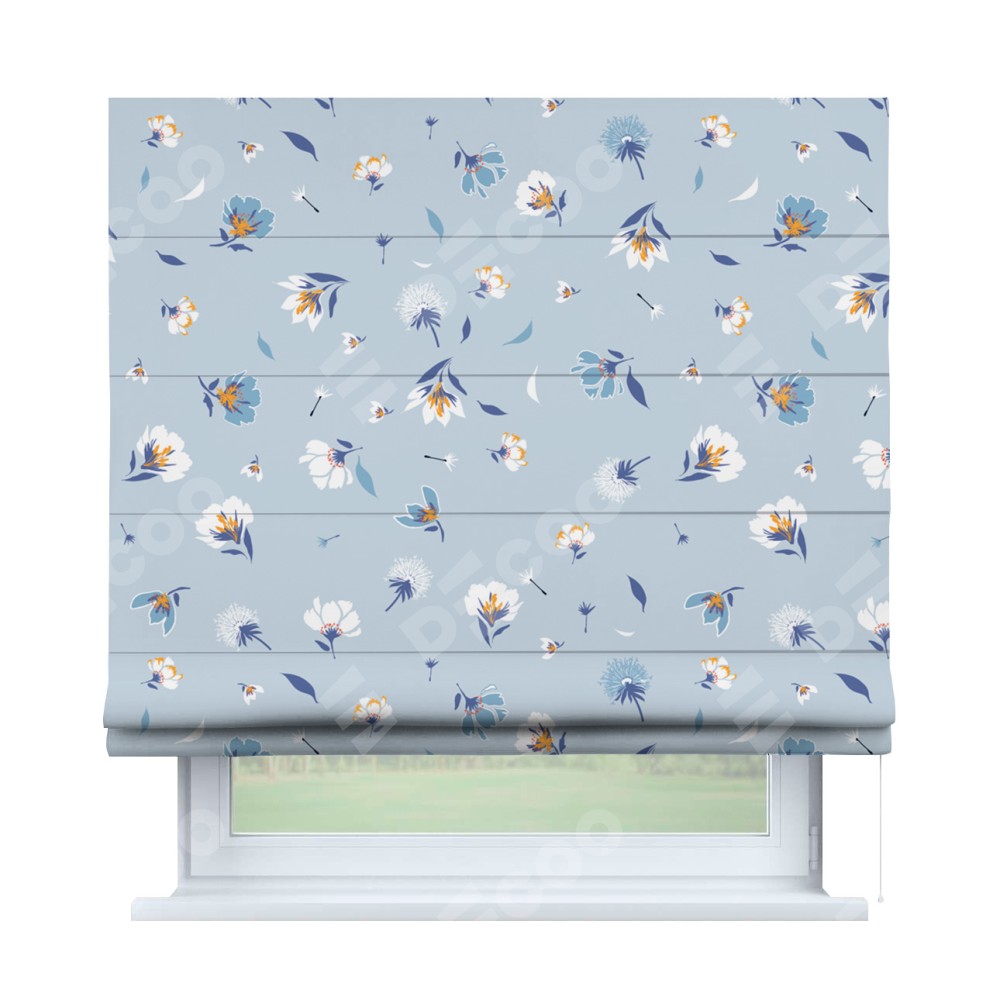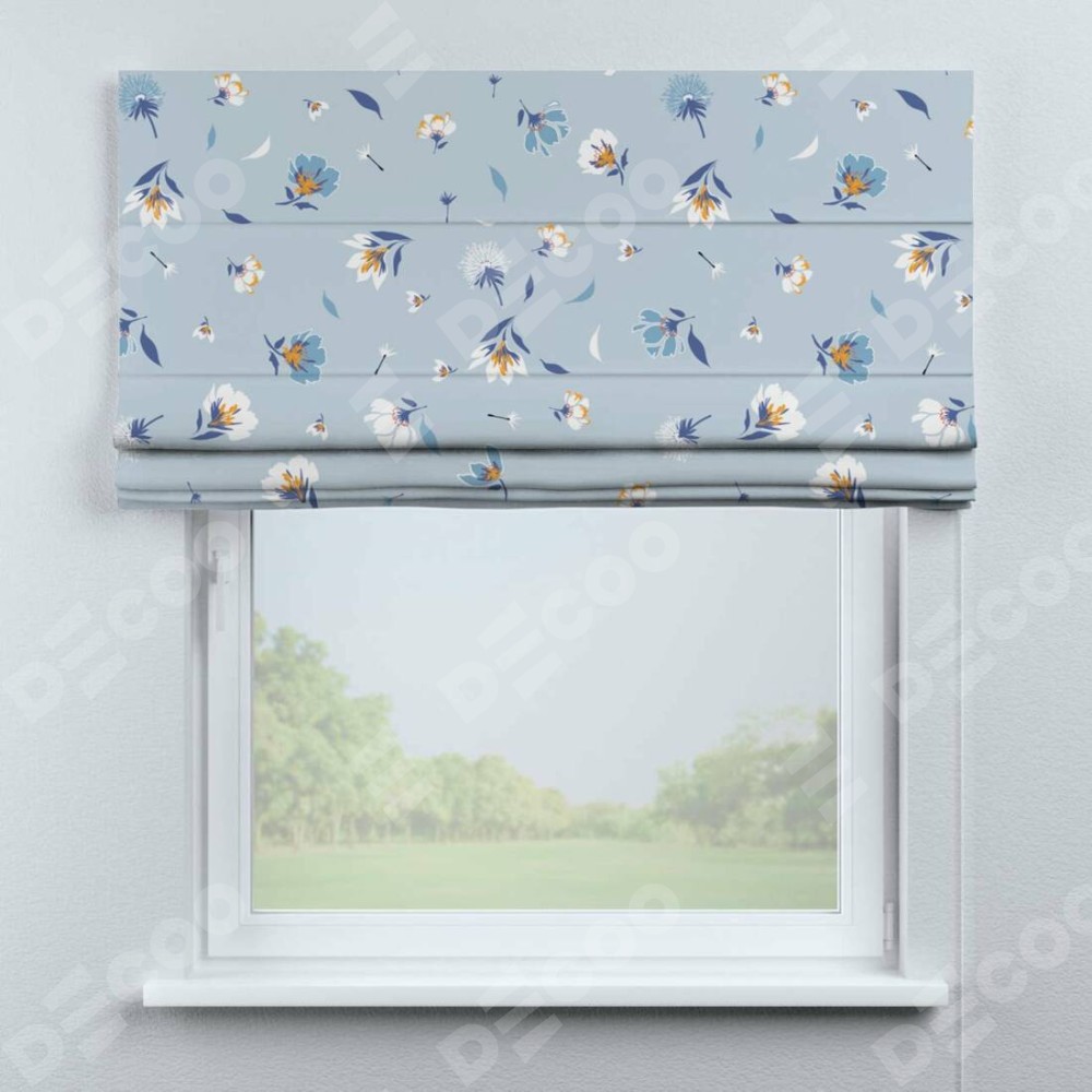 Римская штора производителя «Cortin», используется для проёма, пошита из ткани блэкаут с нанесением сублимационной печати «Голубые цветы». Имеет универсальный механизм и подходит для монтажа: на потолок, на стену и в нишу.