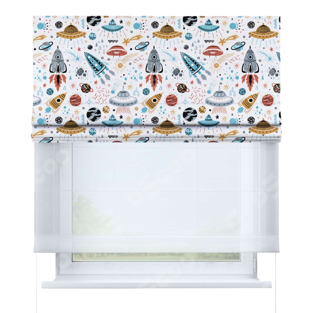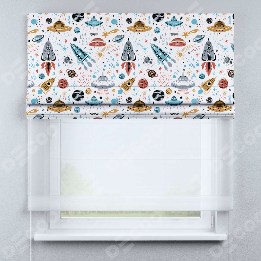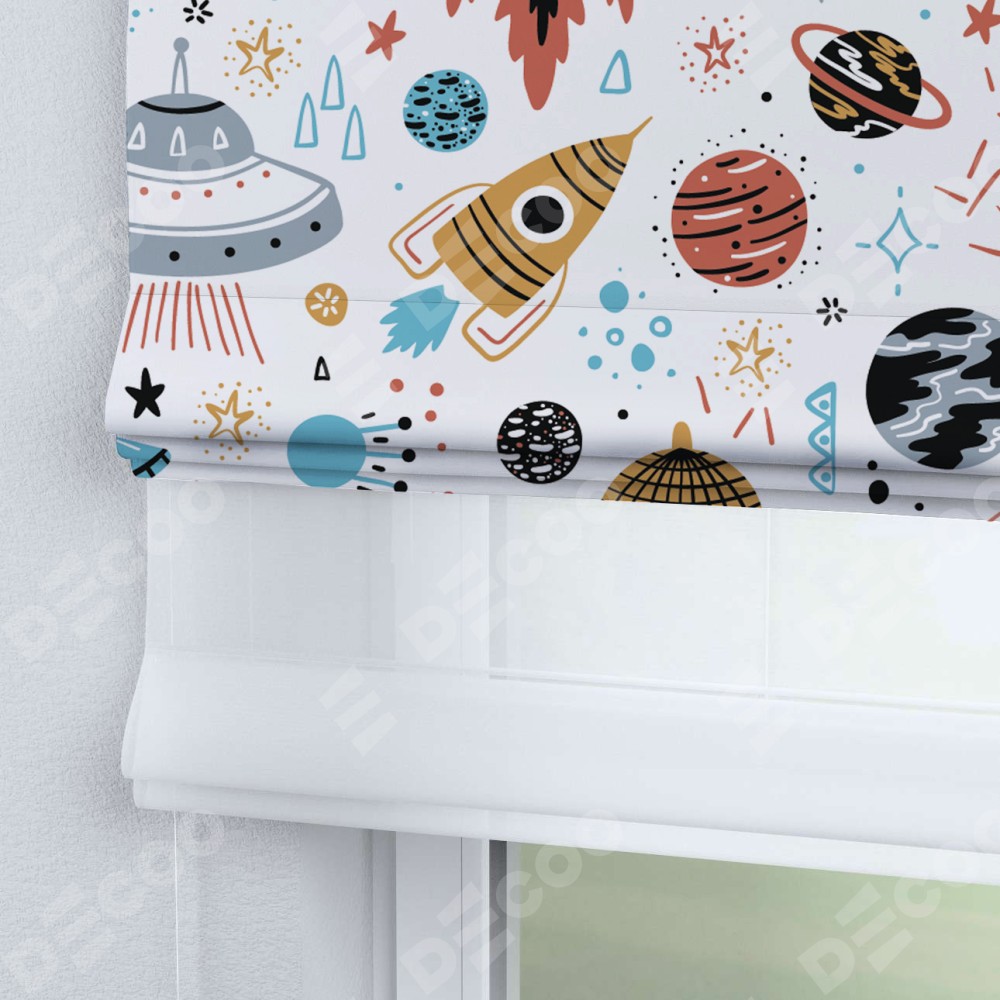 Римская штора день-ночь производителя «Cortin», используется для проёма, пошита из двух полотен, с лицевой блэкаут с нанесением сублимационной печати «Космическое приключение», вторая ткань тюль (по стандарту комплектуется тюль белого цвета артикул V-01). Имеет универсальный механизм и подходит для монтажа: на потолок, на стену и в нишу.