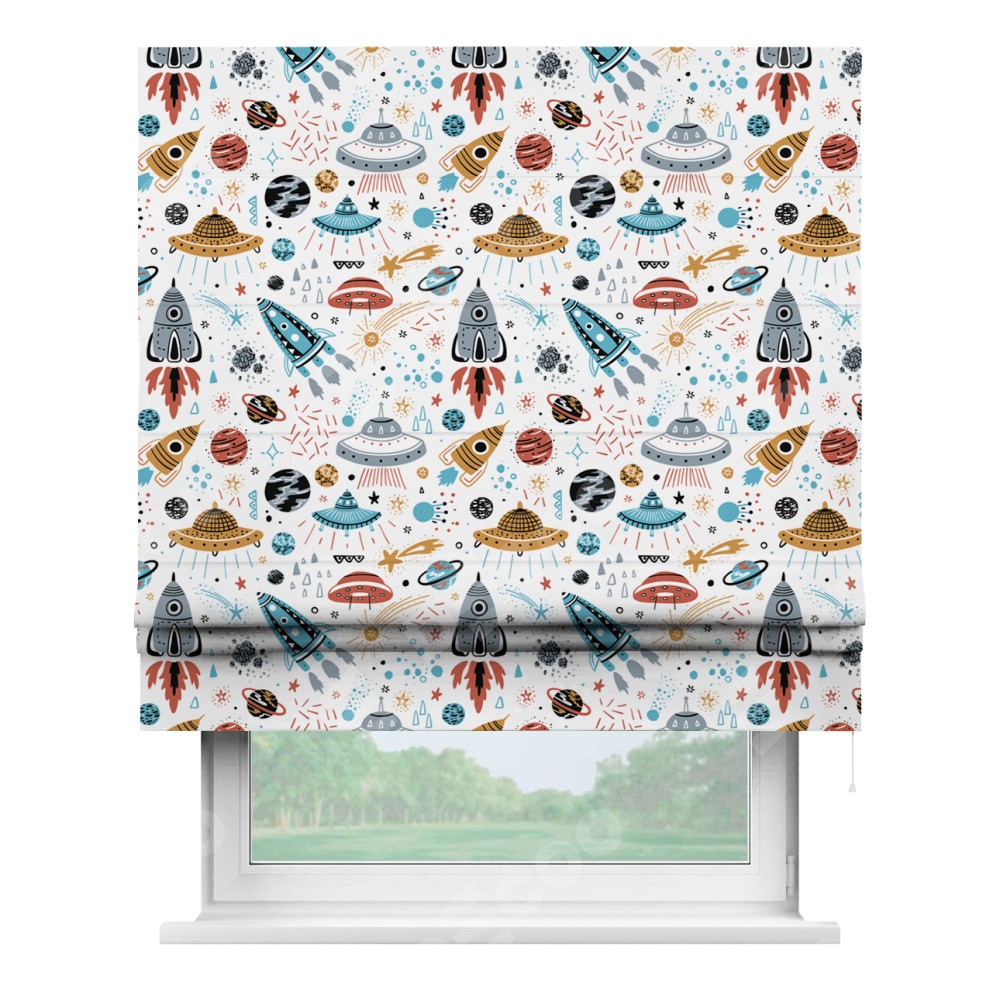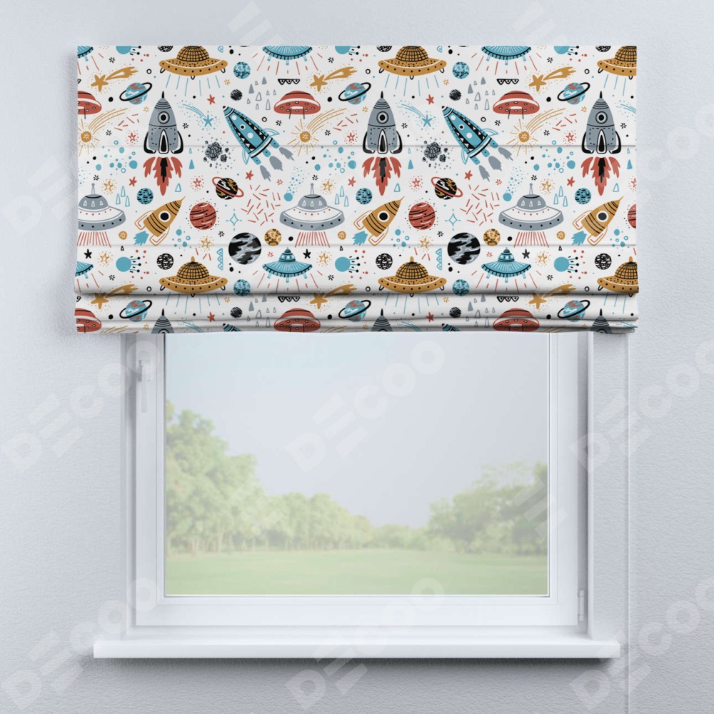Римская штора производителя «Cortin», используется для проёма, пошита из ткани блэкаут с нанесением сублимационной печати «Космическое приключение». Имеет универсальный механизм и подходит для монтажа: на потолок, на стену и в нишу.