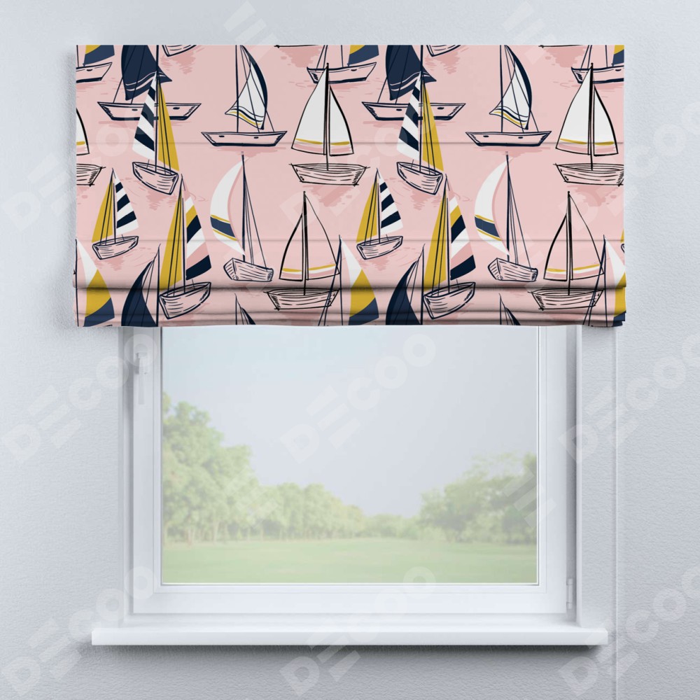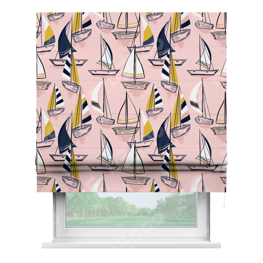 Римская штора производителя «Cortin», используется для проёма, пошита из ткани блэкаут с нанесением сублимационной печати «Парусная регата». Имеет универсальный механизм и подходит для монтажа: на потолок, на стену и в нишу.
