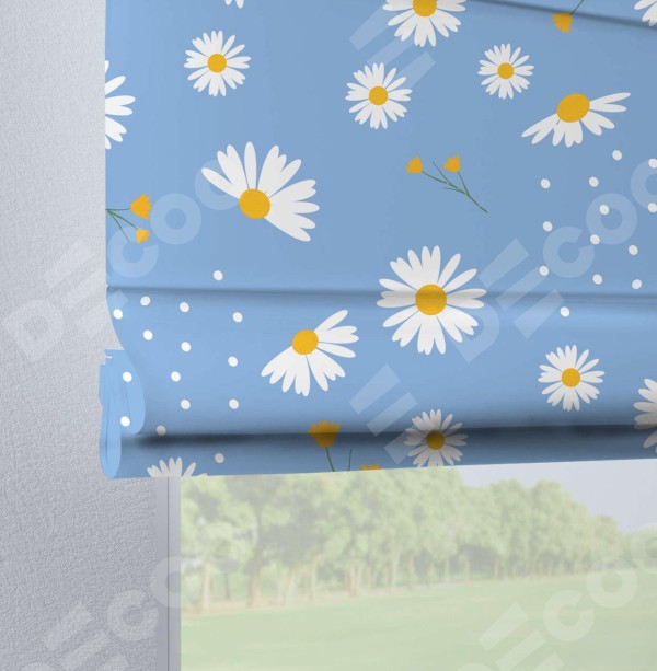 Римская штора производителя «Cortin», используется для проёма, пошита из ткани блэкаут с нанесением сублимационной печати «Ромашки на голубом». Данная модель пошита на петлях, комплектуется на выбор круглым карнизом и подходит для монтажа на стену. Римская штора на петлях имеет простую систему регулировки высоты, отличительным преимуществом данной модели является простой способ монтажа. Достаточно повесить ее на трубу и штора готова!
