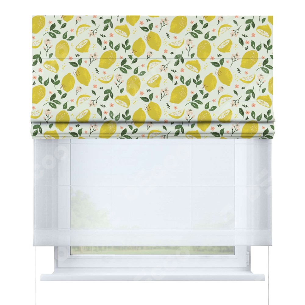 Римская штора день-ночь производителя «Cortin», используется для проёма, пошита из двух полотен, с лицевой блэкаут с нанесением сублимационной печати «Сочные лимоны», вторая ткань тюль (по стандарту комплектуется тюль белого цвета артикул V-01). Имеет универсальный механизм и подходит для монтажа: на потолок, на стену и в нишу.