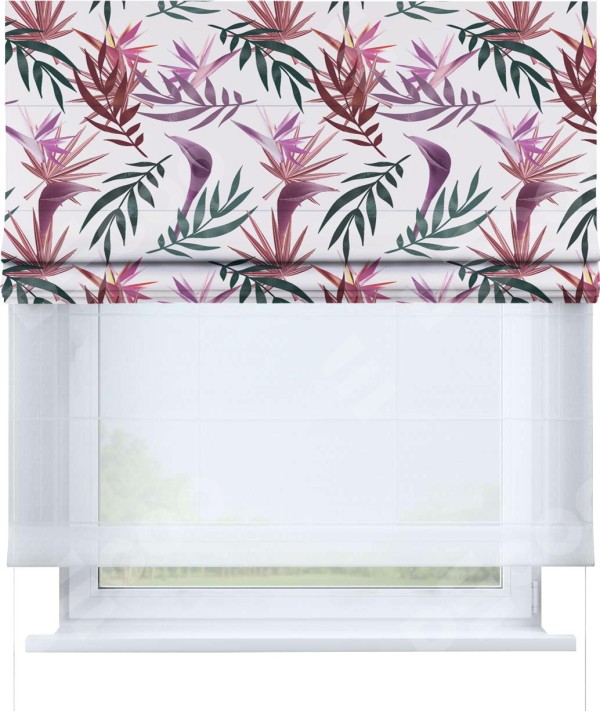Римская штора день-ночь производителя «Cortin», используется для проёма, пошита из двух полотен, с лицевой блэкаут с нанесением сублимационной печати «Тропические побеги», вторая ткань тюль (по стандарту комплектуется тюль белого цвета артикул V-01). Имеет универсальный механизм и подходит для монтажа: на потолок, на стену и в нишу.