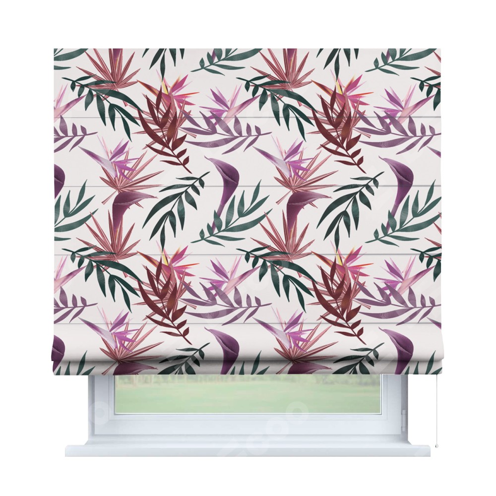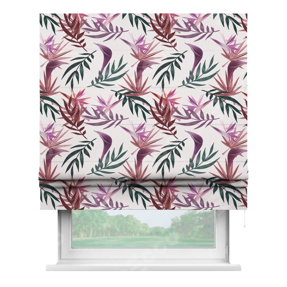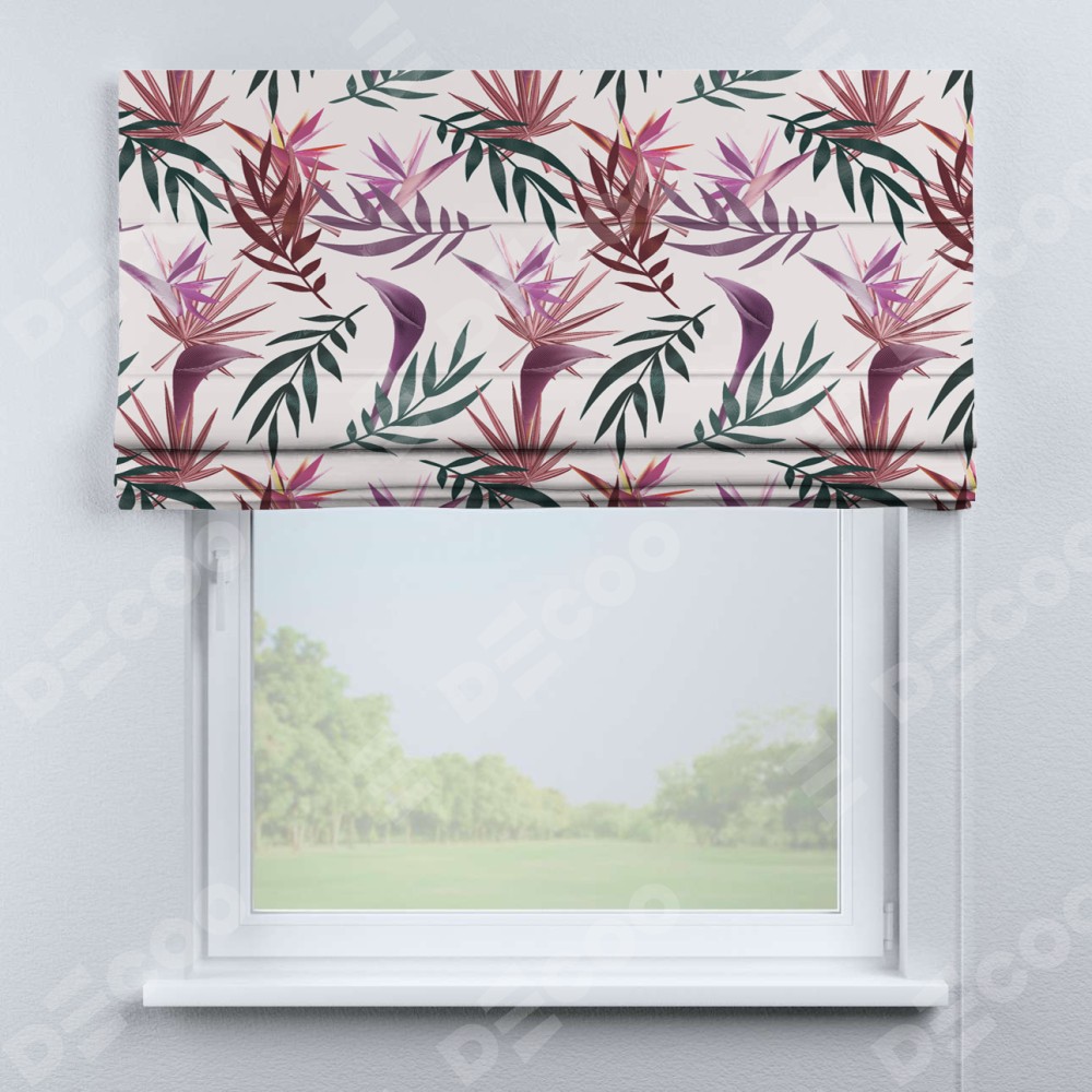 Римская штора производителя «Cortin», используется для проёма, пошита из ткани блэкаут с нанесением сублимационной печати «Тропические побеги». Имеет универсальный механизм и подходит для монтажа: на потолок, на стену и в нишу.
