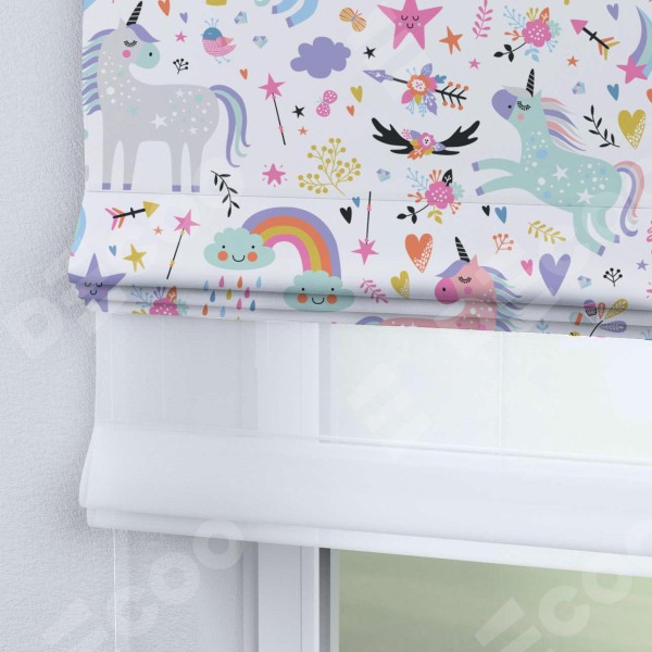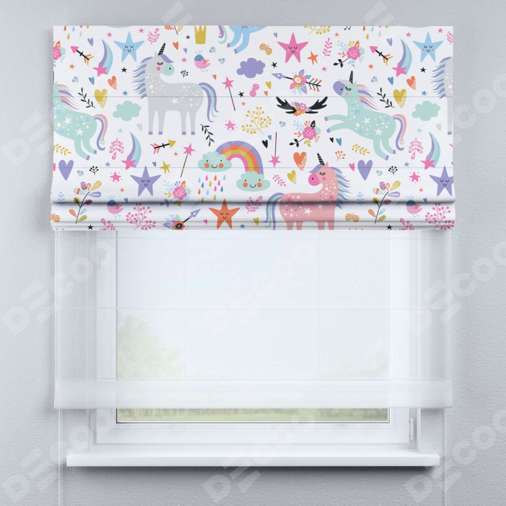 Римская штора день-ночь производителя «Cortin», используется для проёма, пошита из двух полотен, с лицевой блэкаут с нанесением сублимационной печати «Радужные единороги», вторая ткань тюль (по стандарту комплектуется тюль белого цвета артикул V-01). Имеет универсальный механизм и подходит для монтажа: на потолок, на стену и в нишу.