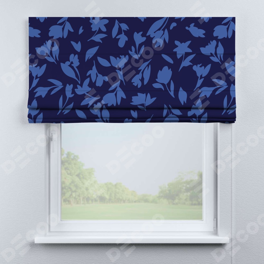 Римская штора производителя «Cortin», используется для проёма, пошита из ткани блэкаут с нанесением сублимационной печати «Синие цветы». Имеет универсальный механизм и подходит для монтажа: на потолок, на стену и в нишу.
